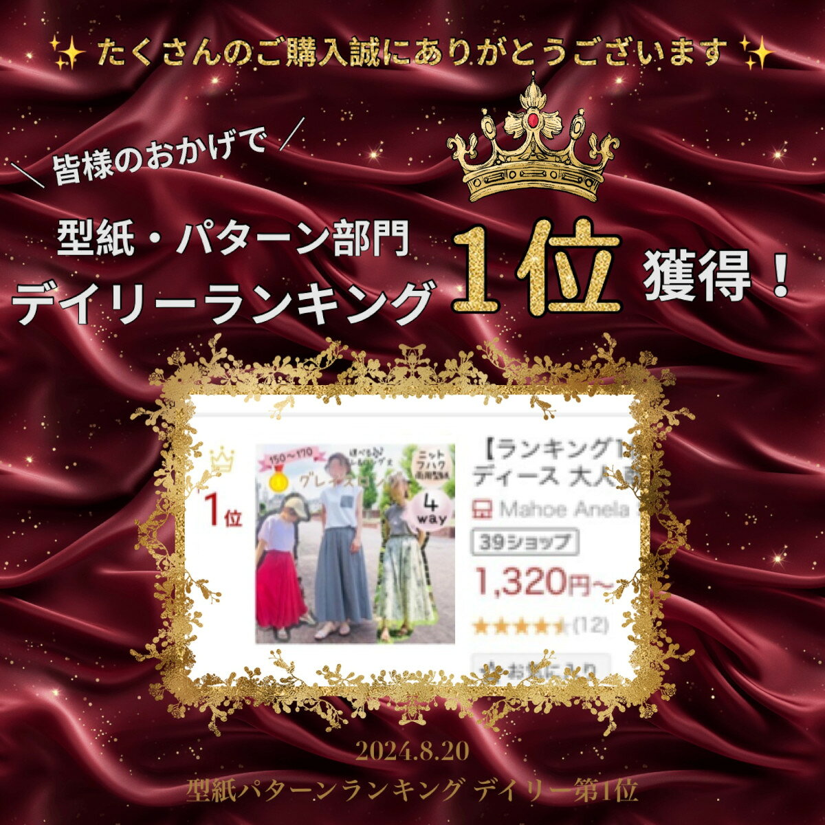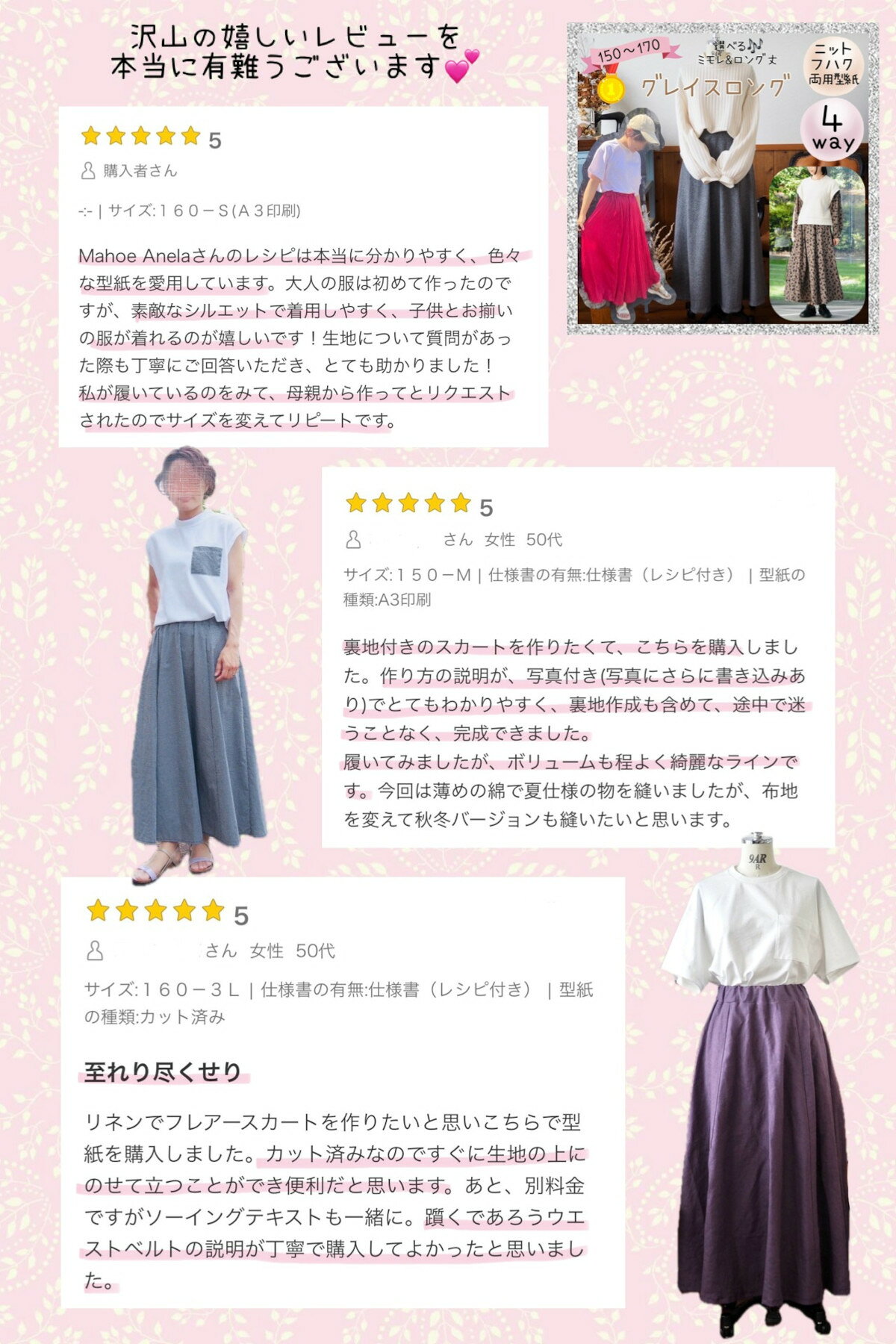 商品情報注意事項価格は1サイズのお値段です。※商品画像は型紙を使用して製作したサンプル作品です。使用される素材によって仕上がりの風合いは異なります型紙について・A3印刷タイプの場合。 カットされていない為、お客様でカットや貼り合わせの作業が必要です。左右対称のパーツは半分しかありません。・カット済み型紙の場合。 カットや貼り合わせの作業はありません。左右対称のパーツも全型でお届けします。仕様書(レシピ)について・「MahoeAnela」の仕様書は、各工程毎にフルカラー写真と説明書きで構成されています。・A4コピー用紙に印刷してお届けします。・なるべく初心者の方にも分かりやすい仕様書作成を心掛けておりますが、もしも疑問点などが出てきた場合はお問い合わせください。・仕様書には水通しや裁断方法等は記載されていません。あくまでも縫製工程のみの仕様書になります。配送について通常、確認メール送信後より1〜2営業日での発送となります。ご注文が集中した場合は更にお時間を頂く事がございますので予めご了承ください。梱包について・A3印刷タイプの場合。 A3用紙を半分に折り畳み、クリアファイルに入れてお届けします。・カット済み型紙の場合。 型紙を折り畳み、クリアファイルに入れてお届けします。商用利用について「Mahoe Anela」の型紙を使用して製作したお洋服は、個人的利用に関してのみ商用利用が可能ですが(ネットオークション・ネットショップ・委託販売等)、その際は【Mahoe Anelaパターン利用の表記、またはリンク】をお願いします。作品の販売は許可していますが、販売によって発生したトラブル等を当店が保障するものではございません。作品販売の際は個々の管理下において責任を持って販売するものとします。転売等について「Mahoe Anela」の型紙、及び仕様書は全てオリジナルです。転用・流用・複写および転売はいかなる理由であっても固く禁止しています。第三者へ型紙を譲渡し、量産する事も固く禁止いたします。※オークション等での転売も同様ですのでご注意ください!ベビー キッズ 姉妹お揃い 姉弟お揃い 兄弟お揃い 兄妹お揃い 家族お揃い 親子お揃い 双子 双子服 双子コーデ リンクコーデ 女性 男性 レディース メンズ ジュニア ユニセックス ジェンダーレス 赤ちゃん ベビー 出産祝い お祝い 出産 ギフト 洋裁 手作り ハンドメイド 70 80 90 100 110 120 130 140 150 160 170 180 SS S M L LL XL XXL 3L 4L 5L 6L カット型紙 カット済 カット済み カット済み型紙 カット済型紙 子供服型紙 子供型紙 子供服 子供 ベビー型紙 ベビー服 赤ちゃん服 初心者 ソーイング ミシン 家庭用ミシン ロックミシン お洒落 おしゃれ かわいい 可愛い 入園 入学 卒園 卒業 冠婚葬祭 結婚式 葬儀 結婚 葬式 お葬式 セレモニー フォーマル 入学式 入園式 卒園式 卒業式 フレアスカート ニット フレアースカート ポンチ ウール 裏地 裏地付き ジュニア 中学生 布帛 ふはく フハク フランネル コーデュロイ LIBERTY リバティ\DEAL対象★今なら10%ポイントバック★更にクーポンMAX150円off/ 【ランキング1位獲得】 型紙 レディース 大きいサイズ 大人 商用利用 3L 4L ロング スカート フレアー 初心者 簡単 ニット フォーマル セレモニー 入学 入園 卒園 170 |4way グレイスロング 上品 な シルエット が特徴の6枚はぎ ロングフレアースカート の 型紙 です。 ニット でも 布帛 でも製作可能。 〇型紙説明ニットでも布帛でも作れるロングフレアースカートの型紙です。ウエストにギャザーがない為、ウエスト周りをすっきり細く見せてくれます。ウエストゴム仕様になっており、面倒なファスナー付けもありません。・作り方はグレイススカートと同じです。 仕様書は共通でご利用頂けます。付属リブを使わず表地のみで製作出来ます。シルエットも上品な為、入園・入学・披露宴などセレモニー服としても◎作りやすさ、履き心地、シルエット、三拍子揃ったおすすめの型紙です。丈は3種類から選べます。 ■ミモレ丈 × ニット ■ミモレ丈 × 布帛 ■ロング丈 × ニット ■ロング丈 × 布帛 の、合計4種類から選んで作れます。・裏地付きにアレンジ可能です(布帛タイプのみ対応) アレンジ方法は仕様書に補足があります。・150-3L&4L、160-3L&4Lはカット済み型紙のみ。・160-3L&4Lは170サイズへの丈延長補正も可能です。ご希望の場合はお問い合わせ下さい。・グレイスタートルにドッキング可能です。 ドッキングする事でグレイスワンピースが製作可能になります。 ※170はグレイスタートルがありません。160のグレイスタートル補正でドッキングが可能になります。 詳細はご案内させて頂きますのでお手数ですが事前にお問い合わせください。〇グレイスタートル(ジュニア)はこちら〇グレイスタートル(レディース)はこちら■華奢見えブラウスとドッキングする事で「華奢見えワンピース」が製作可能になります。 👇👇👇■シームポケット(別売りオプション)がドッキング出来ます。 👇👇👇〇パーツ数 7パ
