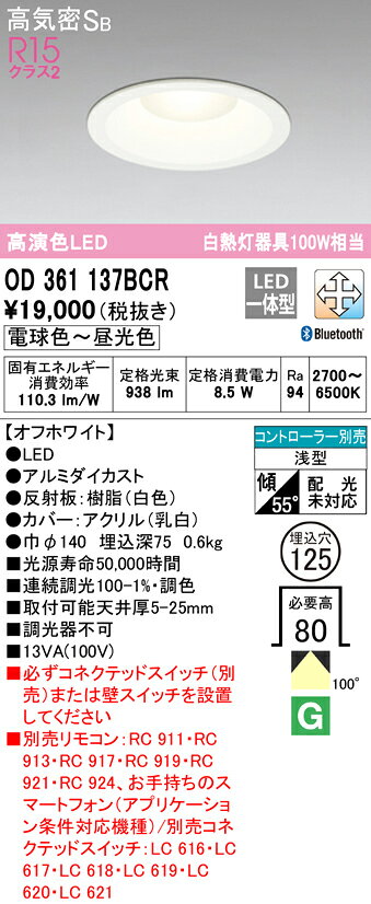 オーデリック OD361137BCR ダウンライト LED一体型 調光調色 Bluetooth 電球色~昼光色 高気密SB リモコン別売 埋込穴φ125 オフホワイト