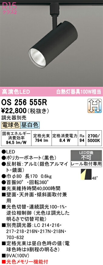 オーデリック OS256555R スポットライト ダクトレール 用・レール取付専用 LED 調光 光色切替調光 調光器別売 LED一体型 電球色・昼白色 ブラック