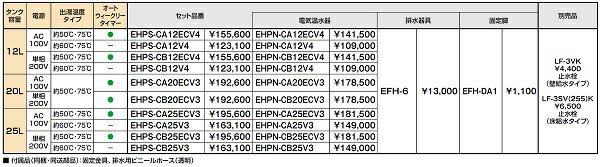 付属品(同梱・同送部品):固定金具、排水用ビニールホース(透明)【警告】■ D種接地工事(アース工事)を必ず行ってください。■ 必ず漏電遮断器を設けてください。感電の恐れがあります。【ご購入の前に】■ 単水栓との組合せはできません。必ず湯水混合できる先止め式水栓金具と組み合わせ、水を混ぜてお使いください。高温の湯が出てヤケドの原因になります。■ 機器内に長時間滞留していた水※は、飲用に用いず雑用水としてお使いください。 ※ 長時間滞留していた水となる目安:1日の手洗人数が、メーカーカタログに記載の連続手洗可能人数以下の場合※画像は代表画像です。※商品によっては取付け工事が必要なものもございます。取付方法につきましては、事前に必ずメーカーHP等でご確認下さい。 【各メーカーお問い合わせ先一覧】 製品に関するお問い合わせはこちらからお願い致します。 2021年3月時点のメーカー情報・カタログ情報に準拠しております。 ※型番を事前にご確認の上、お問い合わせいただきますよう宜しくお願い申し上げます。 ※写真はイメージです ※メーカー都合により外観・仕様は予告なく変更されることがあります。 ご購入前にメーカーサイト等でご確認をお願い致します。 カテゴリ:給湯機器 電気温水器 メーカー:LIXIL リクシル INAX イナックス 型番:ehpn-cb25v3 類似商品はこちらゆプラス INAX/LIXIL EHPS-CB90,120円ゆプラス INAX/LIXIL EHPN-CB100,188円ゆプラス INAX/LIXIL EHPN-CB61,747円ゆプラス INAX/LIXIL EHPN-CA82,744円ゆプラス INAX/LIXIL EHPN-CB98,252円ゆプラス INAX/LIXIL EHPN-CB79,067円ゆプラス INAX/LIXIL EHPN-CA53,968円ゆプラス INAX/LIXIL EHPN-CA98,138円ゆプラス INAX/LIXIL EHPN-CA61,747円新着商品はこちら2025/11/18ダイキン J5CA 業務用除湿機 床置形 冷却1,079,415円2025/11/18ダイキン J2K 業務用除湿機 床置形 冷却式643,815円2025/11/18ダイキン J2KP 業務用除湿機 床置形 冷却643,815円再販商品はこちら2025/11/18パナソニック XND3566SERY9 ダウン30,916円2025/11/18パナソニック XND3567SBRY9 ダウン30,916円2025/11/18パナソニック XND3567SARY9 ダウン30,916円2025/11/18 更新