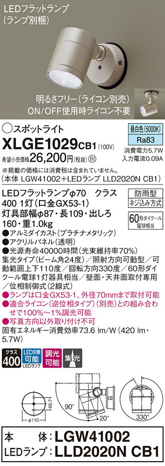 パナソニック XLGE1029CB1(ランプ別梱) エクステリア スポットライト LED(昼白色) 天井・壁直付型 集光24度 防雨型 調光(ライコン別売) プラチナメタリック