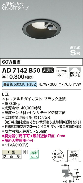 コイズミ照明 AD7142B50 LED防雨型ダウンライト LED一体型 非調光 人感センサ付 ON-OFFタイプ 昼白色 黒色