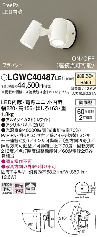 パナソニック LGWC40487LE1 スポットライト 壁直付型 LED(温白色) 拡散 防雨型 ON/OFF型(連続点灯可能) 明るさセンサ付 パネル付型 ホワイト