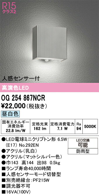 オーデリック OG254867NCR(ランプ別梱) エクステリア ポーチライト LEDランプ 昼白色 人感センサー付 防雨型 マットシルバー