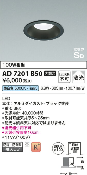 コイズミ照明 AD7201B50 ダウンライト 埋込穴φ100 非調光 LED一体型 昼白色 防雨・防湿型 高気密SB ブラック