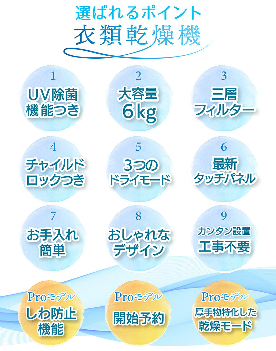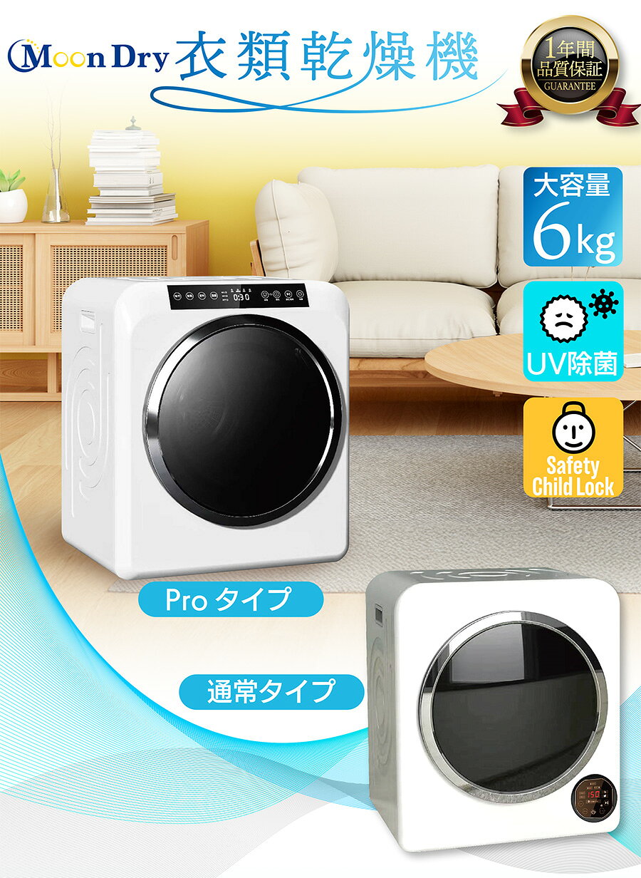 お天気を気にしない! 毎日がお洗濯日和! 衣類乾燥機「MoonDry」6kg 商品名 商品名:衣類乾燥機6kg 「MoonDry」ムーンドライ 選べる2タイプ:通常タイプ/Proタイプ 商品説明 衣類乾燥機 Moon Dry 生活にゆとりとやすらぎを 乾燥機に洗濯物を入れてボタンを押すだけ♪ 通常タイプと3つの機能をプラスしたProタイプの2種類からお選びいただけます。 雨の日のお洗濯にもう悩まない衣類乾燥機、ムーンドライ。 設置工事不要のかんたん設置でコンセントに差すだけで使用開始! 排水タイプではなく蒸気拡散タイプで、設置場所を気にせずどこでも設置ができます。 湿度が気になる方は除湿機や窓を開けてのご使用をおすすめします。 ご家族6人分の衣類をまとめて乾燥できる大容量タイプ! 1人暮らしの方は、1週間分をまとめて乾燥できます。 サイズはコンパクトで小型でも大容量乾燥機におかませ! 操作もタッチパネルで簡単! 花粉やほこり、雨でジメジメする季節に乾燥機は強い味方です。 また、生乾き臭を予防!梅雨時期の強い味方に! 室内であっという間に乾燥できるから家事の時短になり、省エネで電気代も気にならない! Proタイプはしわ防止機能が搭載されており、自動反回転をさせシワを防止し衣類の絡まりを軽減します。 また短時間で均一な乾燥を可能!Proタイプは厚手衣類モード搭載で、ジーンズや毛布もお任せ! ムーンドライは生活にゆとりをあたえる衣類乾燥機です。 サイズ [通常タイプ] H69×W59.5×D52cm [Proタイプ] H69×W59.5×D60cm 排気管上向取り付け時:H76×W59.5×D60cm 排気より右取り付け時:H69×W69×D60cm 特 徴 ・UV-C照射衣類ケア ・三層フィルター ・チャイルドロック付き ・ステンレスドラム ・自動反回転式機能 ・高温60℃ ・大型6kg ・家族6人分衣類乾燥 ・排水不要 ・PSE認証済み [PROタイプ] ・シワ防止機能 ・5段階開始予約 ・厚手衣類モード 機能説明 【UV-C照射で衣類ケア】 UV-Cとは紫外線の一種で、天日干しと同様の効果があり消臭や除菌の効果があると言われています。扉が閉まった状態かつ乾燥運転中のみ照射される仕組みです。安全性試験をクリアしており人体への影響はありませんのでご安心ください。 【MAX60℃乾燥】 50℃以上の熱でダニが死滅すると言われています 。 【三層フィルター】 花粉やほこりゴミをしっかりキャッチします。フィルターは取り外しがカンタンで清掃もラクラク。※最初から取り付けがされている状態でお届けとなります。 不織布フィルターは追加購入が可能です。 【最新のタッチパネル】 操作はタッチパネル式で、かんたん操作! 日本語表記で扱いやすい設計です。 タイマーは30分/60分/90分/120分/150分の5段階。(スマートモードは最大150分) 乾燥モードはスタンダード/バルク/デリケートの3段階+おまかせ自動乾燥モードがあります。 【チャイルドロック・フィルター】 安心のチャイルドロック機能搭載。 【大容量・高級感】 最大容量6kgで一人暮らしやご家族でも幅広くご活用頂けます。 高級感のある外観でお部屋に馴染むインテリアとしても〇 【日本企業企画運営アフターサポートも充実】 日本企業PSE届け出済み商品です。購入後の保証及び各種問い合わせ対応サービスも拡充させています。 家庭用コンセントでご利用頂けます。 カラー [通常タイプ] ホワイト(白) [Proタイプ] ・ダークグレー(黒) ・ホワイト(白) ・シルバーホワイト(銀) 容量 6kg 定格電圧 100V-110V 関連キーワード 衣類乾燥機 6kg UV照射 除菌機能 自動モード タイマー 乾燥 衣類 布団 除湿 洋服 梅雨 湿気 家庭用 一人暮らし フィルター追加購入可能 省スペース チャイルドロック 小型乾燥機 大容量 設置簡単 UV照射 衣類消臭 衣類乾燥 衣類除菌 臭い取り 毛布 シーツ タオルケット 丸ごと 乾燥 ランドリー フィルター 部屋干し 省エネ 雨 花粉予防 梅雨 生乾き タイマー付き 予約開始 家庭用 脱臭 速乾 小型乾燥機 ドラム式 ステンレスドラム 高温除菌 花粉対策 工事不要 置くだけ 節電 布団乾燥 ムーンドライ moondry Yoquna タッチパネル 自動 シワとり 1人用 2人用 3人用 4人用 5人用 6人用 関連商品Yoquna 衣類乾燥機 6kg pro 【SNS1000万再生突破】...Yoquna 衣類乾燥機 3kg 【SNS1000万再生突破】 moo...Yoquna 衣類乾燥機 1kg 【SNS1000万再生突破】 moo...45,800円28,800円7,800円Yoquna 衣類乾燥機 3kg chicモデル【SNS1000万再生...ガラスケース 4段両扉タイプ(鍵付き) 幅80.7×奥行き36.5×高...【元Jリーガー監修】FASTREK プライオボックス ジャンプボックス...24,800円42,000円42,000円エアーコンプレッサー 100v 圧力計 業務用 40l オイルレス 静...犬小屋 犬用ケージ 大型犬 ステンレス ケージ 屋根付き 頑丈 ゲージ...infinity8 OPPテープ 透明 梱包テープ 事務所 引っ越し ...41,000円39,890円40,980円関連ワード: Yoquna 衣類乾燥機 6kg 乾燥機 小型 電気乾燥機 ドラム式洗濯機 室内乾燥機 家庭用 チャイルドロック UV照射 梅雨対策 湿気除去 衣類布団乾燥機 洋服乾燥機 除菌機能 ホワイト操作パネル 一人暮らし安心の1年保証付き! お天気を気にしない毎日がお洗濯日和!衣類乾燥機「MoonDry」6kg!通