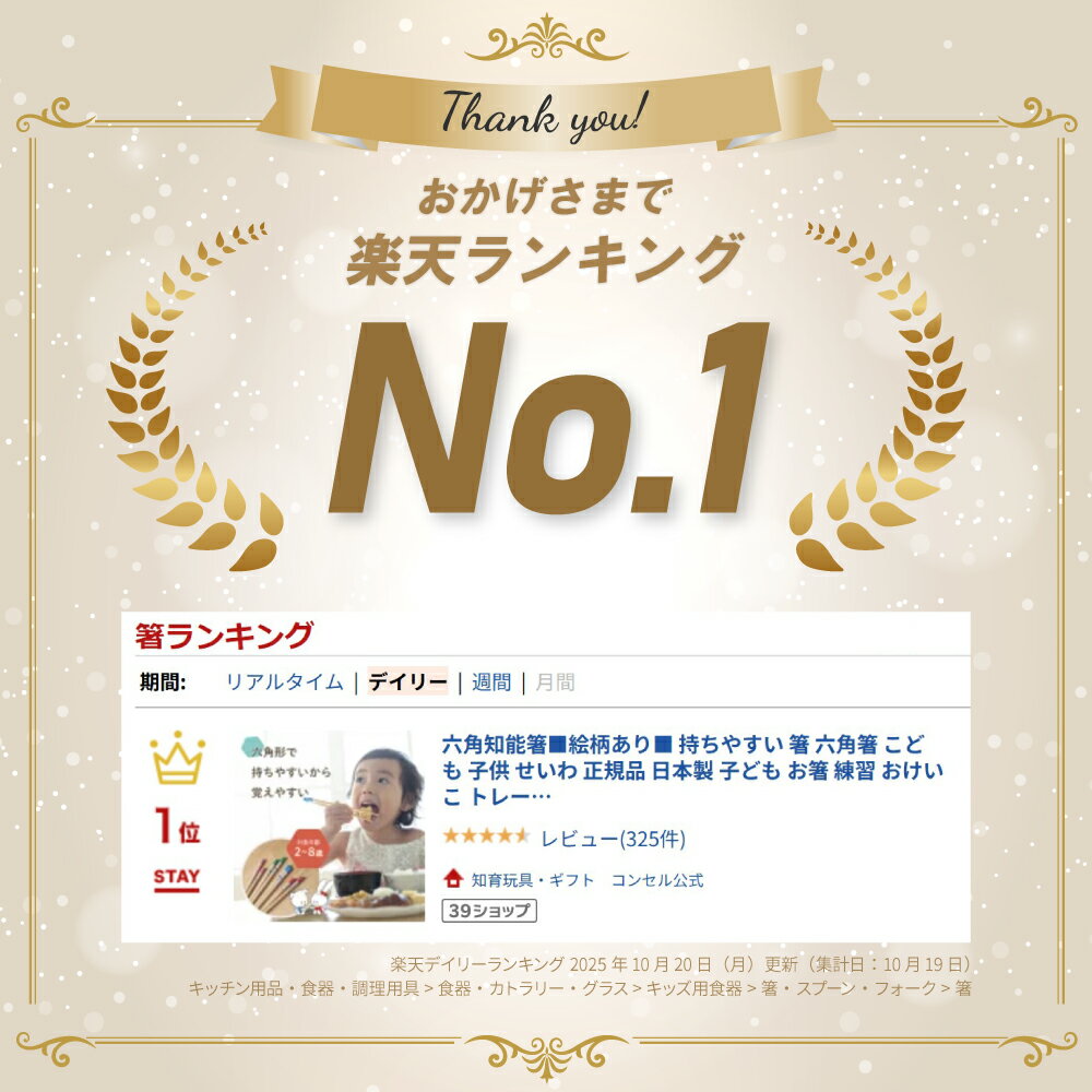知能箸メーカー原案の絵本!やってきたオハシマン 送料無料! 小学3.4年生用、小学5・6年生用は絵柄なし(無地)になりますので下記リンクからご購入下さい。 無地(キャラクター無し)六角知能箸はこちら 六角知能箸用箸箱はこちら 『箸の持ち方で親の躾(しつけ)がわかる』と言われた日本の箸文化。 しかし、箸を持てない子供が多くいます。 この六角知能箸は開発以来なんと200万人ものお子さまにご使用いただき、全国約9500ヶ所の幼稚園・保育園でも御使用いただいております。 昨今、親の「躾」が見直されています。 是非、小さな時から正しくお箸を持たせてあげてください。 お箸が正しく持てることは、お子様にとって一生の宝となることでしょう。 長さ 2歳13cm 3歳14cm 4歳15cm 5歳16cm 1・2年用17cm 【食洗機対応!】 滑り止め加工済み ハシ トレーニング 練習 食育 食事のマナー しつけ 箸の持ち方 当店では、大量注文にも対応しております。必要数量や納期など、ご希望をお気軽にご相談ください。 保育園や幼稚園、児童館などの施設様からの大量注文を承っております。 お誕生日会やクリスマス会、入学式や卒業式など、記念品や景品として多くの商品をご入用の場合も対応可能です。 また、新年度の玩具の入れ替えなどもご相談ください。 楽天での販売の特性上、在庫数量が不足し、ご注文いただけない場合もございますが、弊社には別途施設様用在庫のご用意がございます。 その際は、大変お手数ですが、商品ページ内の「商品についてのお問い合わせ」からご連絡ください。 お電話でのお問い合わせも可能です。お気軽にお問い合わせくださいませ。 コンセル お客様サポート TEL:048-442-8313 受付時間:11:00〜16:00(土日祝定休) <このようなキーワードに興味のある方におすすめです> 箸 子ども おけいこ箸 食洗機対応 六角 持ちやすい 滑らない 保育園 幼稚園 幼児用 小学校 学校 小学生用 キャラクター うさぎ 絵柄 小学1年生 小学2年生 2歳 3歳 4歳 5歳 6歳 7歳 8歳 2才 3才 4才 5才 6才 7才 8才 六角知能箸 子ども用箸 知能箸 六角箸 持ちやすい箸 正しい箸の持ち方 箸トレーニング 食育 滑りにくい箸 食洗機対応箸 練習箸 矯正箸 しつけ箸 木製箸 天然素材箸 マナー おけいこ 幼児用箸 お箸練習 お箸デビュー 食事のマナー 知育 低学年 高学年 六角形 天然竹 竹 滑り止め 職人 ベテラン 躾 持ち方 特訓 箸の持ち方 トレーニング 箸の練習 お箸教室 フィット 軽い レッド ピンク ブルー グリーン 選べるカラー 赤 桃色 青 緑 かわいい お弁当 ご飯 ランチ 食卓 給食 記念品 お祝い ギフト プレゼント プチギフト 男の子 女の子 子ども用 家 おうち 自宅 実家 進級 進級祝い 進学 進学祝い 入園祝い 入園準備 卒園祝い 入園シーズン 春の新生活 新学期 新学期準備 春ギフト 入学祝い 入学準備 入学シーズン 新生活 お弁当グッズ 通学セット 成長祝い 進級ギフト 引越
