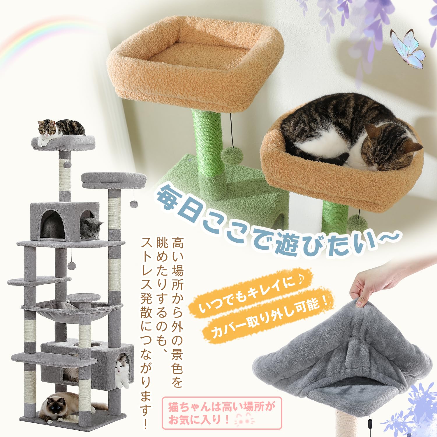 PETEPELA(ぺテぺラ) キャットタワー 大型猫用 コンパクト 多頭飼い 据え置き型 スリム ハンモック 麻紐爪とぎポール 猫のおもちゃ 転倒防止ベルト付き 展望台 猫ベッドカバー取り外し可能 運動不足解消 - グリーン 高さ180cm