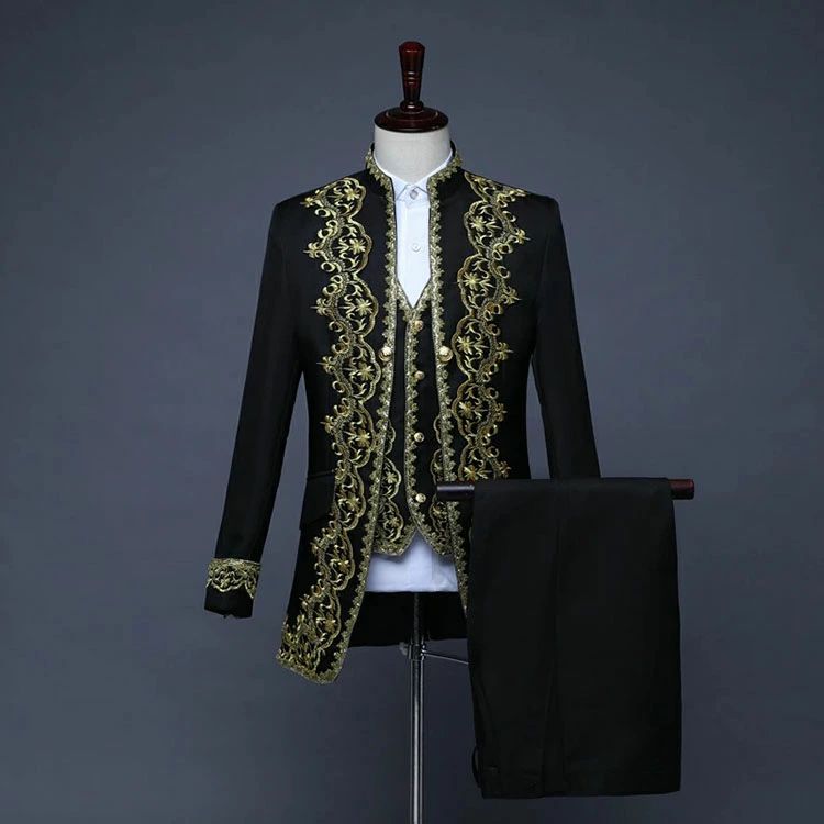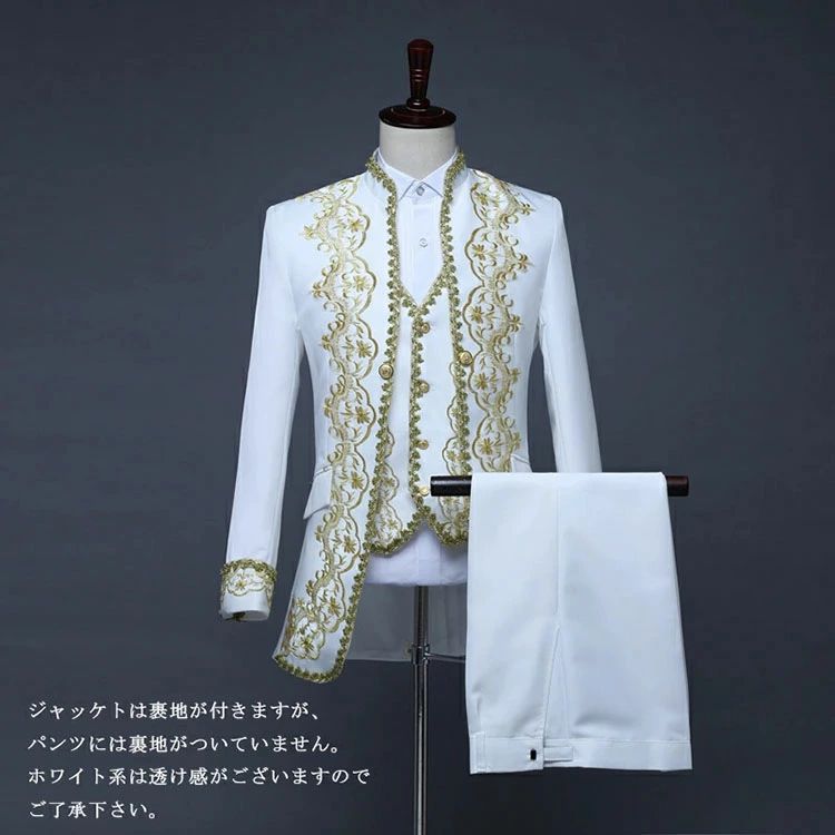 宮廷衣装 演出服 貴族風タキシード メンズスーツ3点セット ジャケット ベスト ズボン 中世の貴族や王子様みたい ダンス衣装 宮廷服 舞台ステージ衣装 演劇オペラ ハロウィン仮装 結婚式 パーティー イペント 余興 コスプレ衣装 S-4XL 白 黒