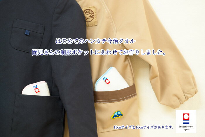 加工方法についてはこちらに画像があります。 サイズ 約13cm×13cm カラー ブルーピンク 素材 綿100% 備考 日本製(今治タオル) ■さまざまなシーンにご利用ください!御年賀 お歳暮 お中元 クリスマス ハロウィン 母の日 父の日 敬老の日 還暦祝い 古希祝い 内祝い 結婚内祝い 結婚祝い 出産祝い 出産内祝い 入学祝い 進学祝い 入学内祝い 入園祝い お返し 卒業祝い 卒部記念 お祝い 結婚引き出物 結婚引出物 結婚式 セット 詰め合わせ タオルギフト 誕生日 プレゼント ごあいさつ ご挨拶 新築祝い 快気祝い 快気内祝い お見舞い 全快祝い 御見舞御礼 長寿祝い 記念品 賞品 景品 引越し 香典返し 弔事 法要 法事 志 四十九日 満中陰志 初盆 偲び草 粗供養 忌明け ラッピング 紙袋が必要な場合は、紙袋 白無地 (大) 紙袋 白無地 (中) 紙袋 白無地 (小) 箱入れをご希望の方は、箱料金をお買い求め下さいませ。はじめてのハンカチタオル13cm(今治タオル) 今治タオルの特徴は風合いと吸水性にあります。 メロウ縫製仕上げでお子様にも今治タオルを持たせたいというお声から手の平サイズ13cnで作成しました。 園によって使用される制服が異なるためポケットのサイズも違います。 通園される制服のポケットを採寸いただき大きさに応じた二種類のハンカチを用意してます。 (13cmと16cmサイズ) 毛足も長く手を洗った際にすばやく吸収する綿糸である贅沢なエンジェル糸を使用しました。 はじめての今治タオルとしてお子様の成長にあわせてご活用いただきたく思い、リーズナブルにお値打ち価格にしております。 ■今治タオルブランド認定タオルとは? 認定番号:第2016-279号にて今治タオルブランド商品認定 はじめてのハンカチタオル16cm(今治タオル)のサイズは こちら Q.ピンクとブルーを購入しましたが、サイズが違うのですが・・・A.タオルの特性上、色の染め方によりタオルが収縮する場合がございます。よって、タオルのサイズは約としてしか表現できません。0.5cm〜1cmの誤差が生じることをご了承下さいませ。このタオルについてはピンクが少し小さくなっております。 Q.1枚から選べるの?A.はい。1枚からお求めいただけます。 注文が集中した場合など、発送が遅れたり、在庫切れで販売できなくなる可能性がございます。 ☆色について・・・できるだけ実物に近くなるように努めておりますが、お使いになられている環境(モニター等)により、微妙に違う場合があります。当サイトは土・日・祝日はお休みですので出荷及び返信メールは休み明けになります。ご了承下さい。 タオルは最初の洗濯でどうしても色落ちの心配があります。長時間汗や水に濡れたり、浸したままにしますと他のものに色移りすることがありますのでご注意ください。塩素系の漂白剤は色落ちしますので使用しないでください。 お買い上げいただいた時に注意事項の用紙をお入れしてます。 毛足が長いのでパイル面を引っ掛けやすいですが、ハサミでお切りいただきましても多少は大丈夫です。 ご注文前によくある質問もご覧くださいね。