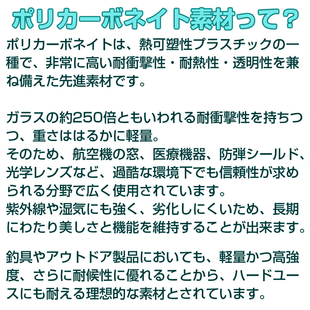 商品の詳細データ メーカー名 ギジェット(GwidGet/疑似餌人) 商品名 リップ製作用 ポリカーボネイトボード カラー 透明 材質 ポリカーボネイト(一般グレード) サイズ はがき:100mm×150mm A4:200mm×300mm 厚み 1.0mm:小型ミノー等のリップに最適 1.5mm:中・小型ミノーをはじめ、様々なタイプのルアーのリップに最適 2.0mm:ミノーからビッグベイトまで、様々なタイプのルアーのリップに対応 3.0mm:ビッグベイトなど強度が必要な大きさのルアーのリップに対応 用途 ルアーのリップ製作、DIY、各種工作 商品解説 耐衝撃性の高さでは樹脂の中で最も強靭な素材で、ルアーメイキングにおいてリップ製作時の材料となるポリカーボネイト板。 他の樹脂素材と異なり、着水時(ミスキャストの時でも)の衝撃にも折れたり割れたりしにくい素材です。 硬質プラスティックの中では抜群の弾性(ガラスの200倍、アクリルの約20〜30倍)を有し、ガラスよりも軽量なことから、ヘルメットのシールドや新幹線の風防まで、あらゆる分野で活躍していますが、ルアーのリップ素材としても非常に優れていることは誰もが知るところです。 ◆加工方法◆ 保護用のフィルム等が貼ってありますので、加工の際には剥がして下さい。 金属用のハサミやクラフト用ノコギリでもカットすることが可能ですが、Pカッターなどで切り目を入れて折り切るようにすることできれいに切れます。 ペーパーで研磨して整形した部分の透明感を復活させるには、プラモデル用の接着剤(樹脂入り)等を塗るのが手軽です。 ※ポリカーボネイトリップの取り付けに瞬間背着剤を使用すると溶剤の影響で脆く割れやすくなることがあります。 瞬間接着剤はリップ取り付け木部の目止めとして使用し、リップの固定には弾性接着剤の使用をおすすめいたします。 ◆ルアーのリップ製作ならこちらもおすすめ◆ ギジェット ガラエポボードギジェット ポリカーボネイトボード リップ製作用 透明 ポリカ板 A4サイズ(200mm×300mm) はがきサイズ(100mm×150mm) クリアー 高強度 一般グレード ルアー自作 DIY 工作 釣具