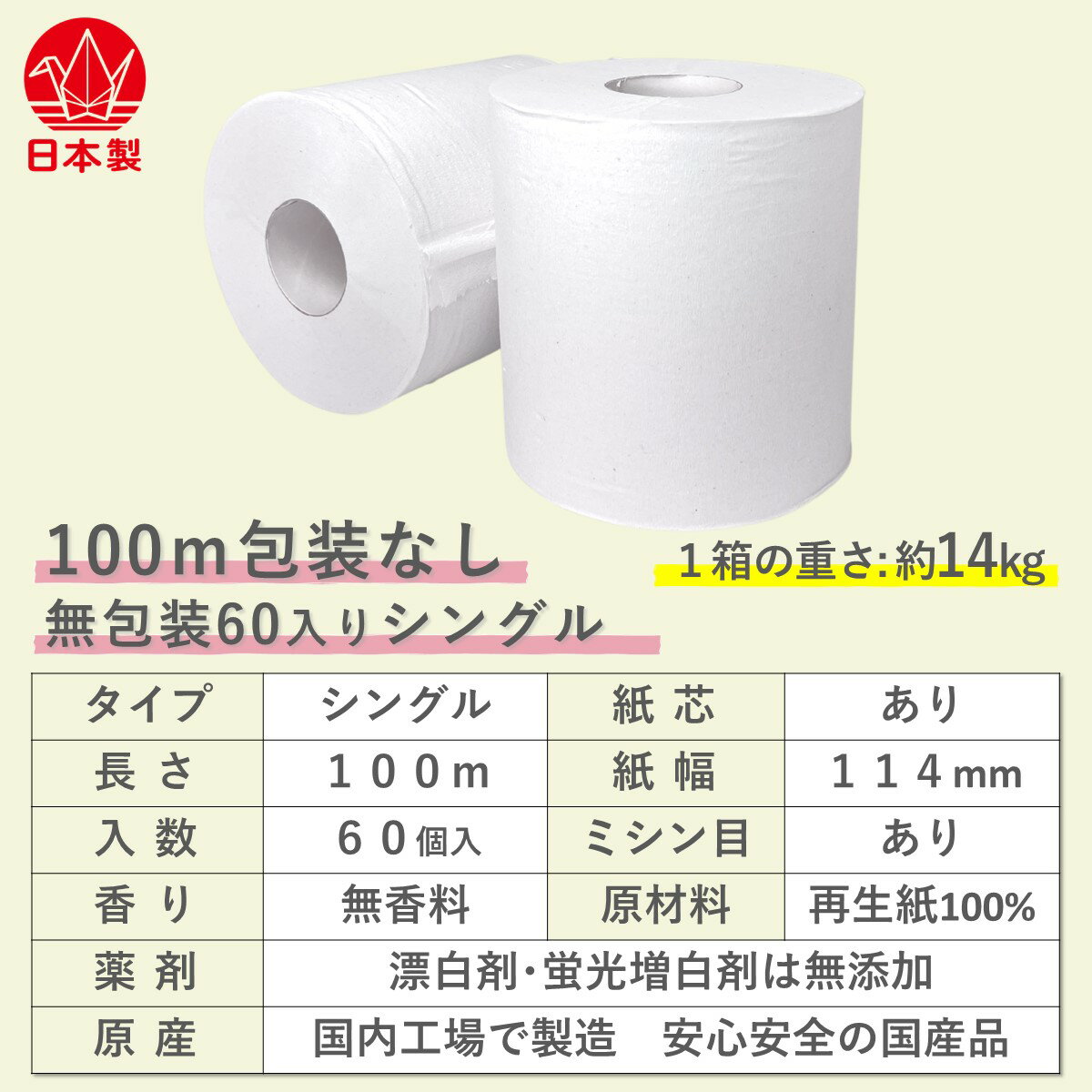 2倍巻き 100m シングル 無漂白 トイレットペーパー 60ロール 無香料 無添加(漂白剤や蛍光増白剤など) 業務用 無包装 再生紙 古紙パルプ100% 芯あり ミシン目あり 100mシングル 60個入 やわらかい ソフト 長持ち1年分 トイレットロール 国産 日本製 牧製紙