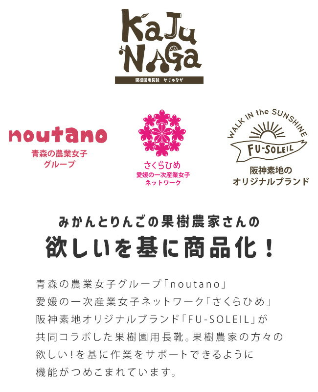 農業専用長靴 レディース FU5014 果樹園用長靴 KAJUNAGA かじゅなが みかんとりんごの果樹農家さんの 欲しいを基に商品化! 青森の農業女子グループ「noutano」 愛媛の一次産業女子ネットワーク「さくらひめ」 阪神素地オリジナルブランド「FU-SOLEIL」が 共同コラボした果樹園用長靴。果樹農家の方々の 欲しい!を基に作業をサポートできるように 機能がつめこまれています。 POINT ■片手でぎゅっと履き口を絞れるマジックベルト仕様。泥や雨、摘果した実が入りにくい! ■滑りにくく土が詰まりにくいオリジナルソール。 ■お手入れしやすく劣化に強いPVC素材を使用。 ■足に優しいクッションインソール。取り外し可能なので靴内を清潔に保てます。 ■両手がふさがっていても簡単に履ける丈。かかと部にはスムーズに脱ぎやすいキッカー付き。 ■滑りにくく屈曲性が良いアウトソールだから快適に歩行ができます。 果樹農家さんの理想の長靴ができました。 ガーデニングや農園などの軽作業におすすめの作業用長靴です。 【Mサイズの参考サイズ明細】 【ソールの高さ】・・約2.5cm 【筒丈】・・約26.5cm 【ワイズ】・・2E相当 【足首回り】・・約34.5cm 【履き口周り】・・(Mサイズ39cm)ベルトで調整可能 【アッパー】・・PVC 【ソール】・・PVC 【重さ】・・(片足)約480g 【カラー】・・りんごレッド/みかんオレンジ/リーフグリーン 【サイズ】・・SS(22.5-23.5cm)/ S(23.5-24.5cm)/ M(24.5-25.5cm) 関連キーワード シューズプラス しゅーずぷらす SHOESplus お洒落 可愛い 土木 釣り フィッシング バードウォッチング 園芸用 果樹園用 造園作業 滑り止め 防寒 つかれない つかれにくい あるきやすい 破れない 絞れる 22.5 23.5 23.5 24.5 24.5 25.5 cm センチ 2502