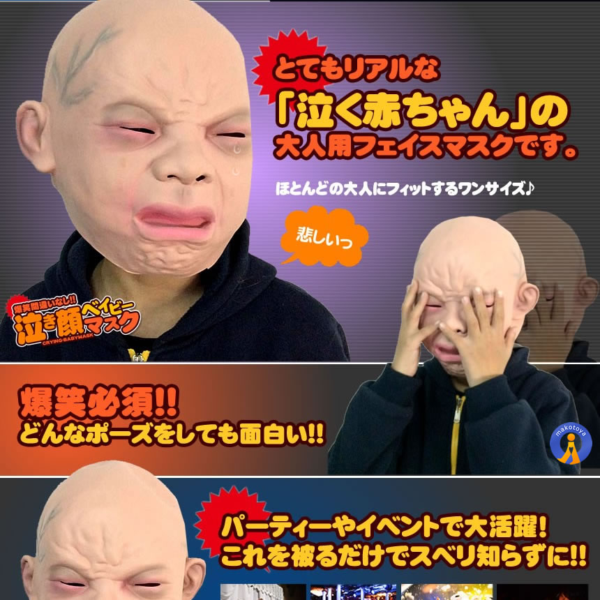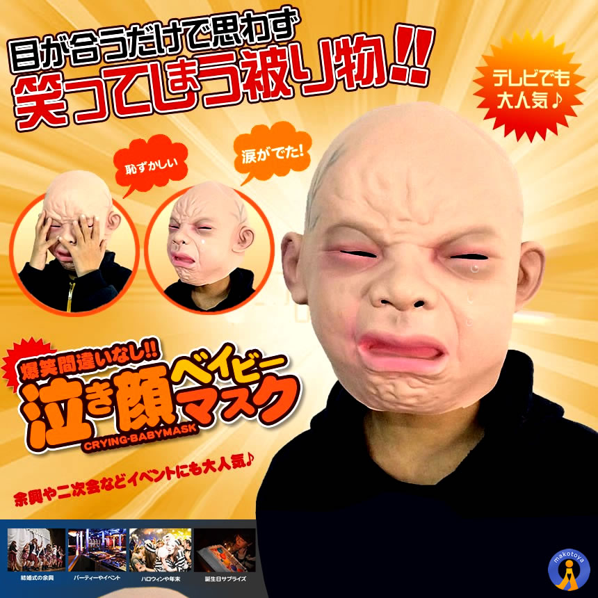 目が合うだけで思わず笑ってしう被り物 テレビでも大人気の「泣き顔ベイビーマスク」が登場!!! 余興や二次会などイベントにも大人気♪ とてもリアルな「泣く赤ちゃん」の大人用フェイスマスクです。 ほとんどの大人にフィットするワンサイズ♪ 爆笑必須!!どんなポーズをしても面白い!! パーティーやイベントで大活躍!これを被るだけでスベリ知らずに!! 年中通して様々な事で使用できる。 商品サイズ:約35.5×23cm 首口約:28cm 重さ:約170g ※誤差±1-2cm ※開封時少しゴムの匂いがしますので、使用前に1-3日天日干ししてください。 送料無料※北海道は+300円UP、離島及び沖縄県は+400円UPにて承ります。