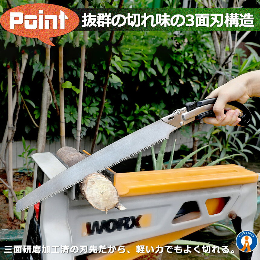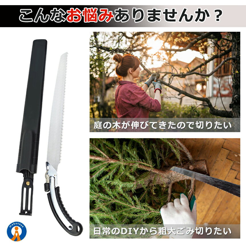 【 切れ味抜群/万能のこぎり 】・三面研磨加工済の刃先だから、軽い力でもよく切れる。・のこぎりに最適なSK5鋼を採用・滑り止め加工されたTPRハンドルだから、手になじんで持ちやすい。・不意の刃の飛び出しを防ぐため、安全ロック機構を採用・生木の切断、庭木の剪定、粗大ごみ解体、木工作業、仮枠作業、DIY、キャンプやアウトドアなど、多様なシーンで活躍【サイズ/重量(約)】全長 :49cm刃渡り:約33cm【ご留意ください】※ノコギリの刃にゆとりを持たせた状態で到着します。到着後にプラスドライバーで刃の揺らつきが無くなるまでネジを閉めてご利用下さい。※配送により若干スレ、汚れ等が付く場合がございます。予めご了承ください。 ※北海道は+400円UP、離島及び沖縄県は+800円UPにて承ります。