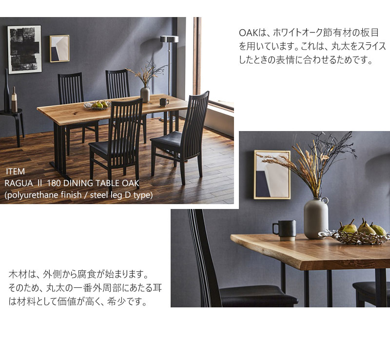 ■北海道・沖縄・離島への配送はお受けできません 【天然木の特性について】 ・自然に存在するものを製作しているため、一点一点表情が異なります。これは、人工物ではないからこそ生まれる差異となります。 ・無垢材は、耐久性や質感に優れる反面、反りや割れのリスクが少なからずございます。材そのものが生きているため、ゼロにはできない事象です。 ■サイズ 幅1650×奥行850×高さ705mm 天板厚:25mm ※耳付きのため、奥行は個体差があります。 ■材質 【WN】 ウォールナット節有無垢 【OAK】 ホワイトオーク節有無垢 ■塗装 天板:オイル塗装 or ウレタン塗装 スチール脚:粉体塗装 ■仕様 F☆☆☆☆、日本製、組立式 関連ワード:ダイニングテーブル 食卓 テーブル 机 オイル塗装 オイルフィニッシュ 食卓 食堂机 ダイニング キッチン 木製 天然木 無垢材 木材 節有り 節あり ウォールナット アメリカンブラックウォールナット ホワイトオーク ナラ エフフォースター F☆☆☆☆ 国内生産 日本製 国産品 1点 北欧風 高級 おしゃれ オシャレ モダンデザイン モダンスタイル 自然 ナチュラルテイスト 福岡 関家具 通販 家具 インテリア■RAGUA II 165DT W1650×D850×H705mm ■脚間寸法 ※スチール脚は脚位置を調整出来ます。 内側=内側に取り付けた場合の脚間 / 外側=外側に取り付けた場合の脚間 ・スチール脚A 内側:W1290mm、外側:W1390mm ・スチール脚B 内側:W1301mm、外側:W1401mm ・スチール脚C 内側:W1320mm、外側:W1420mm ・スチール脚D 内側:W1320mm、外側:W1420mm 良質な木材だからこそ用意のできる耳付きのテーブルです。中心と外側でコントラストが強くでるウォールナットで展開しています。用途に合わせて仕上げを選べますので、フリーメンテナンスで水気に強いウレタン塗装か、木の温もりを存分に楽しめるオイル塗装からチョイスしてください。スチール脚を4型から選べますので、お好みのスタイルが作れます。 ■サイズバリエーション ・NiPPONAIRE RAGUA II 幅150 ・NiPPONAIRE RAGUA II 幅165 ・NiPPONAIRE RAGUA II 幅180 ・NiPPONAIRE RAGUA II 幅200 【!】配送について 運送会社による開梱・組立・設置作業(梱包材処分)での配送となります。 配送地域によっては時間指定をお受けできなかったり、配送日に制限がある場合がございます。大型商品の場合、搬入経路の確認、設置場所の確保は事前にお願い致します。エレベーターなしの集合住宅や階段搬入はお受け出来ない場合がございます。 納期・在庫について、在庫がある場合は約1〜2週間でのお届け予定となります。人気商品のため生産が追いつかず、在庫欠品時はメールにて次回納期をご連絡の上、ご相談させていただきます。