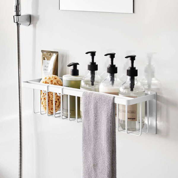 商品詳細 ■商品名 マグネットバスルームバスケット タワー ワイド ■サイズ 本体:約幅44.3cm×奥行き12.3cm×高さ12cm (内寸) バスケット:約42.7cm×奥行き8.8cm×高さ10cm バー:約42.7cm×奥行き2.5cm ■素材 本体:スチール(ユニクロメッキ+粉黛塗装) マグネット 滑り止め:シリコーン ■重量:約1.45kg ■耐荷重 バスケット:約3kg バー:約1kg フック1つあたり:約250g ■備考 取り付け可能な壁面 マグネットがつく平らな面・スチール壁面 ■JAN 4903208037693 4903208037709 ■品番 03769 03770 ■型番:BT-TW CP WH BK スタッフコメント マグネットで壁面へ簡単に取り付けられる収納バスケットです。様々な空間に溶け込むモノトーンのシンプルなデザイン。収納力抜群のワイドタイプで、お風呂場の壁面に取り付け、シャンプーなどのボトル類をまとめて収納することができます。本体は強力なマグネットでしっかり固定できるので、ずり落ちず、ストレスフリー。収納したままディスペンサーのポンプを押せて便利です。バスケット部分は格子状で水がしっかり切れます。ボトルとの接地面も少ないので嫌なヌメリを予防できます。お風呂用の掃除道具やおもちゃを収納するのもおすすめです。小物を引っ掛けて収納するのに便利なフック付き。バーにはタオルを掛けたりスプレーボトルを引っ掛けられます。水や汚れに強いスチール製で、お手入れも簡単です。【 山崎実業 マグネットバスルームバスケット タワー ワイド tower 】 強力な磁石でしっかり固定水切れのいい大容量バスケット マグネットバスルームバスケット タワー ワイド マグネットで壁面へ簡単に取り付けられる収納バスケットです。 様々な空間に溶け込むモノトーンのシンプルなデザイン。収納力抜群のワイドタイプで お風呂場の壁面に取り付け、シャンプーなどのボトル類をまとめて収納することができます。 本体は強力なマグネットでしっかり固定できるので、ずり落ちず、ストレスフリー。 収納したままディスペンサーのポンプを押せて便利です。バスケット部分は格子状で 水がしっかり切れます。ボトルとの接地面も少ないので嫌なヌメリを予防できます。 お風呂用の掃除道具やおもちゃを収納するのもおすすめです。小物を引っ掛けて収納するのに 便利なフック付き。バーにはタオルを掛けたりスプレーボトルを引っ掛けられます。 水や汚れに強いスチール製で、お手入れも簡単です。 INTRODUCTION 商品紹介 気軽に収納スペースを増やしたい方に お風呂場の壁面に取り付けられる シンプルなマグネットバスケット マグネットがくっつく平らな面に設置できる収納バスケットです。お風呂場の壁面にピタッと簡単に取り付け可能。シャンプー、コンディショナー、ボディソープなどのボトル類をまとめて収納することができます。 強力な磁石でずり落ちない しっかりと固定したい方にそのままポンプも押せて便利 背面には幅広の強力マグネットが付いているので、しっかりと固定されます。シリコーンの滑り止め付きでずり落ちず、ストレスフリー。収納したままディスペンサーのポンプも押せて便利です。ラバータイプでサビにも強く、浴室内でも安心して使えます。 ワイドだからバスグッズをひとまとめ収納力のあるバスケットをお探しの方に こちらのバスケットは約幅44.3cmと収納力抜群のワイドタイプです。複数の場所に分けず、一括収納できるので、お風呂場がすっきりと片付きます。 バスケットは水切れがよく乾きやすいヌメリを予防したい方衛生面にも配慮したい方に バスケットは水はけのよい格子状になっています。通気性がよく、水が溜まらないのが嬉しいですね。ボトルとの接地面も少ないので嫌なヌメリも予防できます。カビや水垢を防ぐ、衛生面にも配慮したデザインです。 浮かせて省スペースに設置したい方にスリムで場所を取らないのも◎ 壁面に浮かせて設置することで、浴室内のデッドスペースを賢く活用できます。また、設置しても場所を取らないスリムなデザインなので、お風呂場を広く使うことができます。 お風呂掃除をスムーズにしたい方にまとめておけばサッと手に取れる お風呂場の掃除道具の収納場所としても活用できます。水切りワイパーやブラシ、スプレーやバスブーツなど、ひとまとめにできるので、使いたいものがサッと手に取れ、お風呂掃除がスムーズに。 お風呂用おもちゃの収納にお困りの方に お子様の手の届く位置に設置すれば お片付けの習慣も身に付きやすい お子様が使うお風呂用おもちゃを収納するのもおすすめです。磁石で取り付けるので、お子様が収納しやすい高さに調節して設置できます。お子様目線の収納スペースを作ることで、遊ぶ時も取り出しやすく、お片付けもスムーズに。 様々なインテリアに馴染みやすい おしゃれなモノトーンカラー シンプルなモノトーンのカラーリングで洗練された空間に。ナチュラルで清潔感のあるホワイト、ワンポイントでおしゃれさが引き立つブラック、お好みのカラーが選