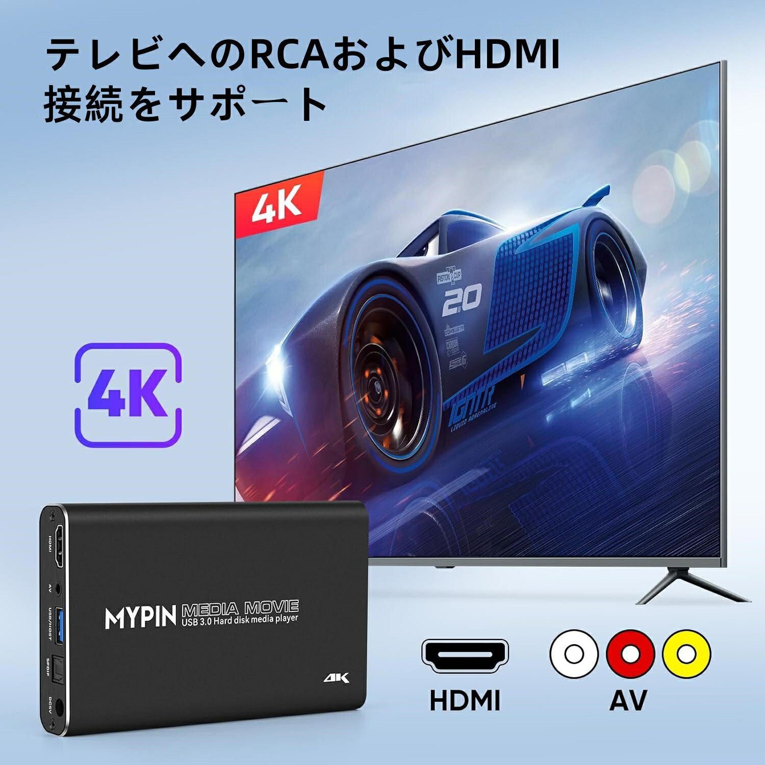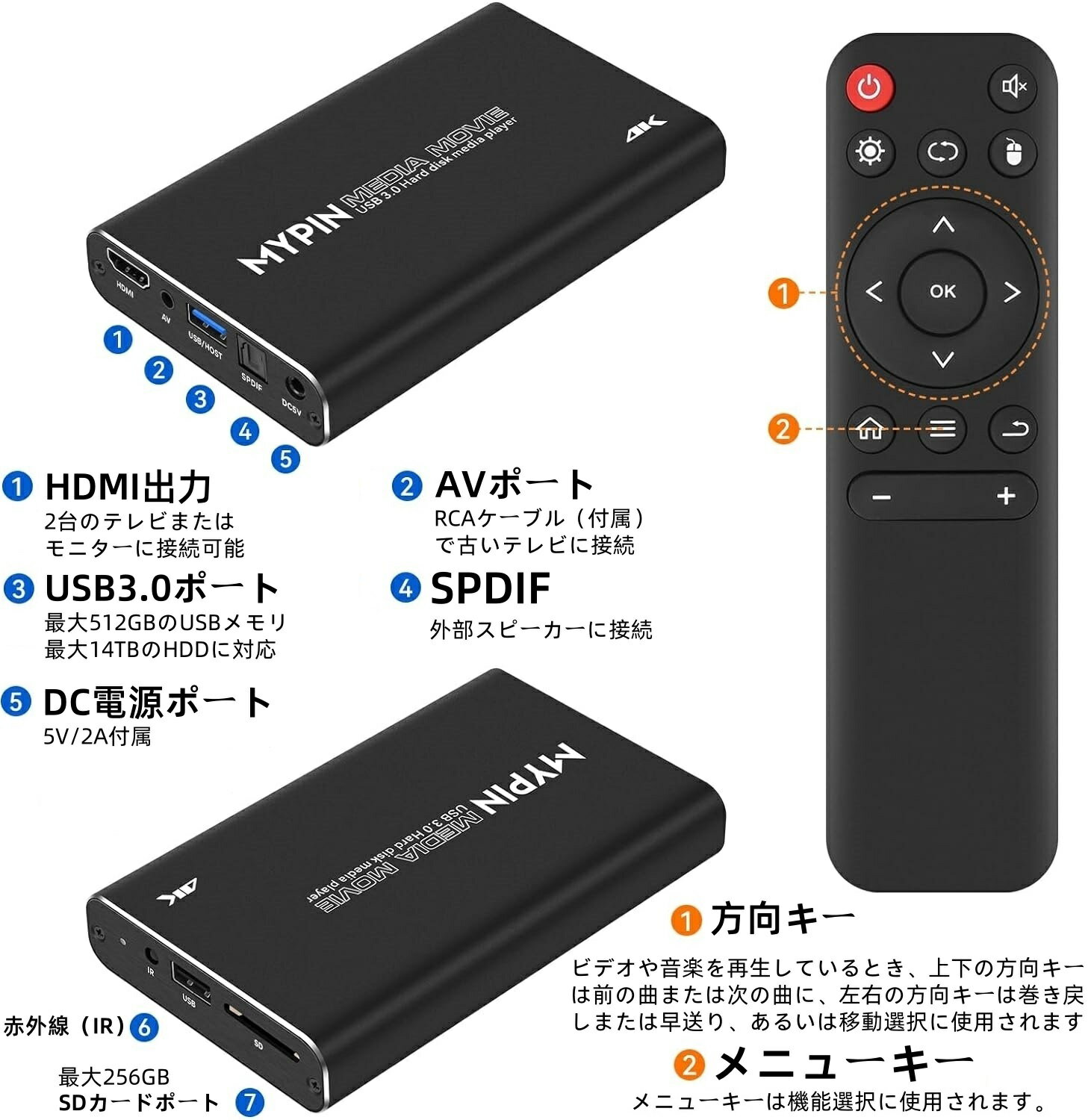 4K@30Hz USB3.0 HDMIメディアプレーヤー、2.5inch SATA HDDに対応し、HDMI/AV/オプティカル出力端子を備えた、H.265 MP4ポータブルプレーヤー、USBメモリ/SDカードから動画・音楽・写真を再生可能で、最大4GBの内部ストレージまたは8TBの外付けHDDをサポート