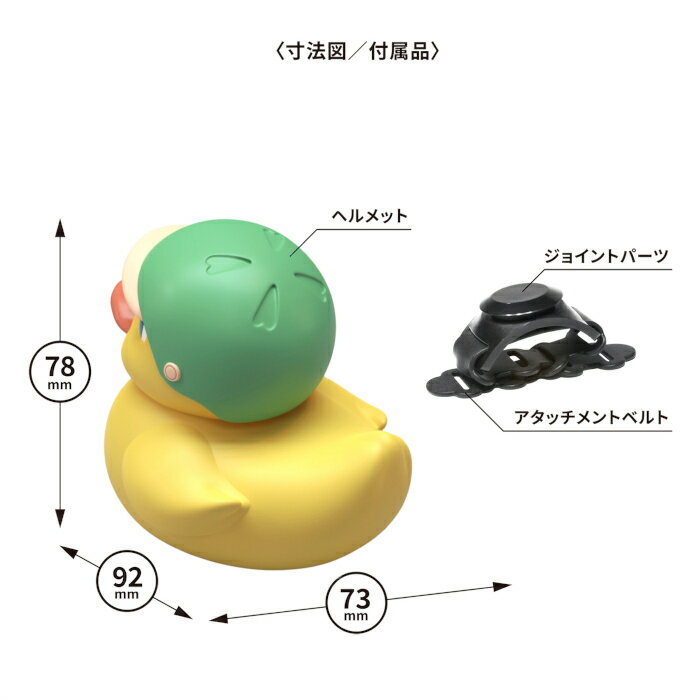 ダッくんダックラバーダックコレクションは、全6色のカラフルで愛らしいデザインが魅力の自転車用アクセサリーです。 本体を強く押すと楽しい音が鳴り、子供から大人まで幅広い年齢層に喜ばれます。また、水でっぽうとして使えば、水遊びがもっと楽しくなり、プールやお風呂の時間が待ち遠しくなること間違いなしです。 自転車のハンドルなどに簡単に取り付けられるアタッチメントベルトが付属しており、移動中もダッくんダックがあなたの旅を彩ります。 各色ごとに異なる着脱可能なヘルメットも特徴の一つで、お好みのシールでペイントやデコレーションしてカスタマイズを楽しむことができます。 このユニークなキャラクターデザインは、繊細で独特な世界観が魅力で人気の原型師・大畠雅人氏によるもの。 日常の移動を楽しく彩るだけでなく、お子さまのおもちゃとしても、またコレクションとしてもぴったりのこのアイテム。 プレゼントにも最適で、きっと受け取った人を笑顔にしてくれることでしょう。 ダッくんダックで、毎日をもっとカラフルに、もっと楽しく過ごしませんか? ©Ampus Inc. All rights reserved. サイズ高さ 約8cm 重さ約80g 素材PVC 付属品アタッチメントベルトヘルメット キャラクターデザイン・原型大畠雅人 その他特許庁意匠登録1742361※写真は製品サンプルです。実際の商品とは異なる場合があります。ご使用のモニターにより実際の色と違って見える場合があります。 検索ワード ダックン だっくん ダックンダック だっくんだっく プレゼント ギフト クリスマス 誕生日 1歳 2歳 3歳 4歳 5歳 6歳 7歳 1才 2才 3才 4才 5才 6才 7才 男の子 女の子 幼児 赤ちゃん 孫 甥っ子 姪っ子 保育園 幼稚園 入園 入学 おもちゃ インテリア フィギュア あひるちゃん アヒルちゃん アヒル あひる お風呂遊び プール 水遊び