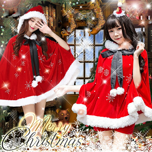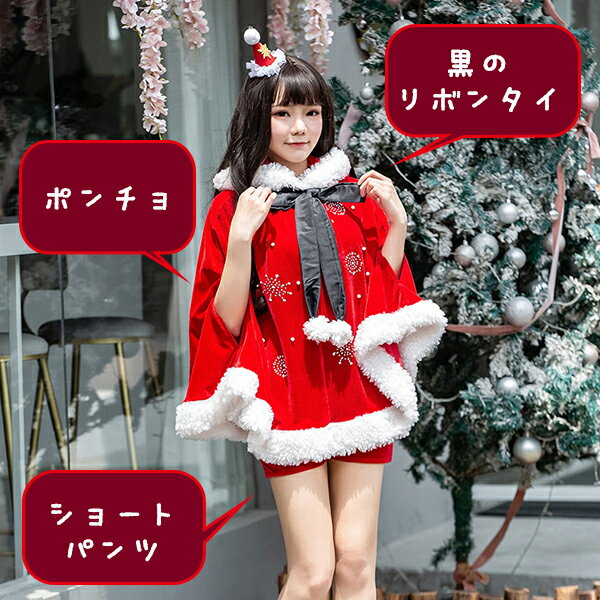 【最安値挑戦中】サンタガール(ポンチョ&パンツ)★ マント クリスマス パーティ コスプレ ポンチョ ケープ フード付き ショートパンツ セクシー サンタクロース Xmas セットアップ 3点セット フリーサイズ かわいい 大人 子供 レディース ネコポス送料無料!
