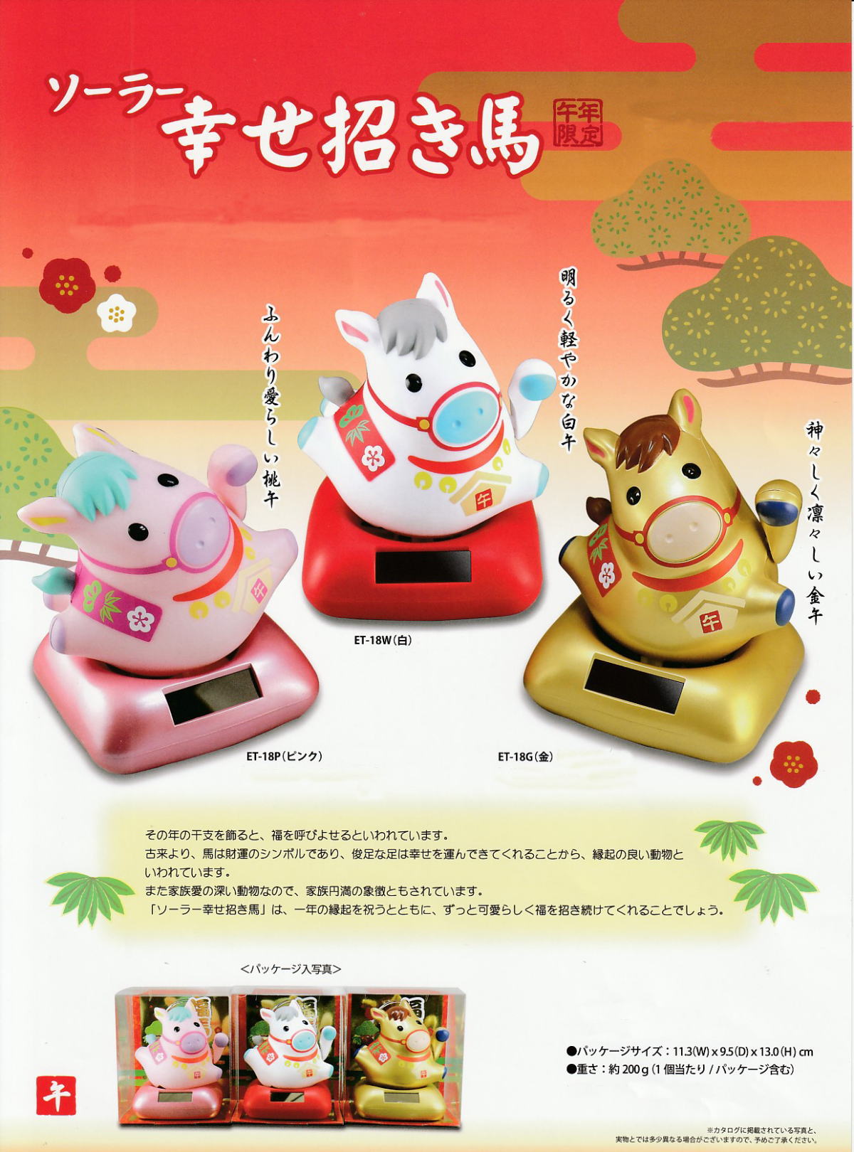 〇商品概要:【ソーラー幸せ招き馬・金】 比較 飾り 風水グッズ 開店祝い 縁起物 の オルネコイデ ※ご不明な点がございましたら、お気軽にご連絡くださいませ。TEL:03-3841-6480 Eメール:info@orner-koide.com セール期間中は、多くのご注文が集中することが予想されております。 スタッフ一同、ご注文の発送業務に全力を尽くしますが遅れがでますことをあらかじめご了承ください。※実店舗との併売のため、在庫ありとなっていてもタイミングによっては売り切れてしまう場合もございます。どうぞご了承ください。/ 移転祝い 花 / 周年祝い / 飲食 周年 祝い 贈り物 / 開店 周年記念品 / 記念品 / 開店祝い 花 / サロン /☆オルネコイデ公式LINEお友だち登録で割引クーポンプレゼント☆ 限定クーポンも! サイズ:幅11.3cm×奥行き9.5cm×高さ13(cm) 重量:200g その年の干支を飾ると、福を呼び寄せると言われています。 古来より馬は財運のシンボルであり、俊足な足は幸せを運んできてくれることから、縁起の良い動物といわれています。 また家族愛の深い動物なので、家族円満の象徴ともされております。 「ソーラー幸せ招き馬」は一年の縁起を祝うとともに、ずっと可愛らしく福を招き続けてくれることでしょう。 台座のソーラーパネルで光を吸収し、体の動きにつられて、頭が左右に不規則にゆらゆらゆれます。透明ケースに入っているので、そのまま飾れます。 手ごろな大きさで、玄関先やデスクの上に置くのに適しています。 御年賀などのギフトやノベルティにとても人気が高い干支の置物となっております。 実物が写真と色合い・風合いが多少異なる場合がございます。ご了承くださいませ* よく一緒に購入されている商品ソーラー幸せ招き馬・金ソーラー幸せ招き馬・白 ※11月中旬発送予定です。 セール期間中は、多くのご注文が集中することが予想されております。 スタッフ一同、ご注文の発送業務に全力を尽くしますが遅れがでますことをあらかじめご了承ください。 /サンキュークーポン 飲食 周年 祝い 贈り物 外国 人 が 喜ぶ おみやげ 東京 お土産 おしゃれ 外国 人 プレゼント 外国人 お土産 商売 繁盛 オルネコイデ 開院祝い 整骨院 接骨院 猫 好き の 人 に プレゼント 粗品 販促 景品 縁起 町内会 敬老会 神社 寺社 年末 年始 家庭用 業務用 合格祈願 グッズ 受験生ポイント消化 ポイント消費 ポイントアップ実施中 猫の日限定 猫の日キャンペーン 猫の日 グッズ※セール品はラッピングを承りませんので、ご了承ください。 店舗ディスプレイ