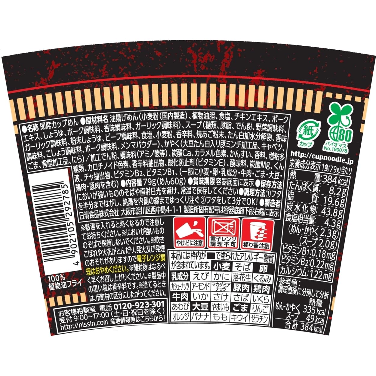 商品説明■ 情報1「カップヌードル」が "もつ鍋" に、いつもとひと味違う、やみつきになる味わい■ 情報2内容量:1食79g ×20個■ 情報31971年に発売したカップ麺「カップヌードル」は、多くのお客さまにご愛顧いただいているインスタントラーメンのブランドです。■ 情報4近年、市販の食品や雑貨などを自分の好きなようにカスタムする "魔改造" がSNSなどで話題になっており、インスタントラーメンでもさまざまな "魔改造" レシピが誕生しています。そこで今回、「カップヌードル」の定番フレーバーを弊社自ら "魔改造" した商品を発売します。■ 情報5「魔改造カップヌードル」は、「カップヌードル」のスープをベースに、にんにくとニラの風味、肉の旨み、野菜の甘みをきかせた "もつ鍋しょうゆ味" が特長です。■ 情報6魔改造 した「カップヌードル」の "背徳的ウマさ" を、ぜひ体感してください。■ 情報7ふだん食べなれている日常の食品を防災用に備えておくことはローリングストックと呼ばれています。日常生活で消費しながら定期的に買い足していくと、災害時の備蓄や非常食になります。■ 情報8原材料・栄養成分表示などの詳細は、各商品パッケージをご覧ください。■ 情報9商品紹介 カップヌードルをニラとニンニクで魔改造 カップヌードルをニラとニンニクをいれて魔改造してみたらうまかった!肉の旨みあふれるもつ鍋しょうゆ味!?具材は謎肉、ニラ、キャベツ、背脂、ごま。 原材料・成分 油揚げめん(小麦粉(国内製造)、植物油脂、食塩、チキンエキス、ポークエキス、しょうゆ、ポーク調味料、香味調味料、ガーリック調味料)、スープ(糖類、豚脂、でん粉、野菜調味料、ガーリック調味料、粉末しょうゆ、ビーフ調味料、食塩、小麦粉、香辛料、焼あご粉末、たん白加水分解物、香味調味料、こしょう調味料、ポーク調味料、メンマパウダー)、かやく(大豆たん白入り豚ミンチ加工品、キャベツ、ごま、背脂加工品、にら)/加工でん粉、調味料(アミノ酸等)、炭酸Ca、カラメル色素、かんすい、香料、増粘多糖類、カロチノイド色素、香辛料抽出物、酸化防止剤(ビタミンE)、酸味料、炭酸Mg、くん液、チャ抽出物、ビタミンB2、ビタミンB1、(一部に小麦・卵・乳成分・牛肉・ごま・大豆・鶏肉・豚肉を含む) 使用方法 【1】フタを半分まではがし、熱湯を内側の線までゆっくり注ぐ【2】フタをして3分でOK!