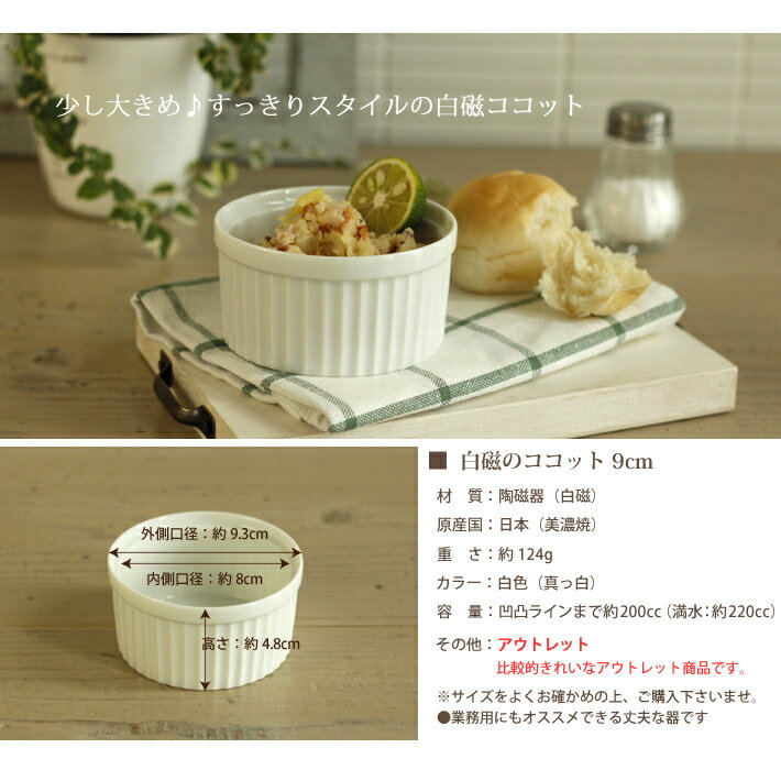 ワンプレートのおともに。美しい白磁です。小鉢料理色々使えて便利な万能食器「白磁のココット_9cm」。ワンプレートのおともに、サラダやヨーグルト、フルーツなど。定番のスフレの形は飽きが来なくてずっと使える!小鉢料理、デザートボウル、フルーツボウルなどにぴったりの器です。白磁の上質な器ですので、光に当てるとうっすら透け感があります。 商品情報 サイズ口径約9.3cm 高さ約4.8cm 材質陶磁器(白磁) 生産国日本(美濃焼) カラー白色 重さ約124g 容量内側ラインまで約200cc(すりきりは220cc) ご注意商品についてサイズをよくお確かめの上、お買い求めください。 使用上の注意 電子レンジ 食洗機 オーブン ラッピング不可 関連商品