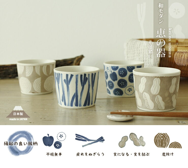 縁起の良い食べ物のおしゃれな絵柄「恵の器_そば猪口」 手書き風の優しい絵柄で4種類のデザインがあります。 そば猪口、茶わん蒸し、小鉢、タンブラー、多目的カップなど使い道はたくさん。厚みも程よいこちらの食器は、スタッキングもでき業務用にもオススメです。 商品情報 サイズ口径:約8.5cm 高さ:約7cm 材質陶磁器/梨地(細かな点があるのが特徴です。) 生産国日本(美濃焼) Made in Japan カラー梨地・クリーム色(絵柄付き) 重さ約175g 容量約250cc(すりきり)※八分目は約180cc ご注意陶磁器の特性上、下記の物があります。メーカー検品範囲内で出荷しております。 下記での理由の返品、交換は対応致しかねます。 ■ 釉薬の濃淡、ムラが「必ず」あります。 ■ ピンホールが見られます。 ■ 釉薬の色飛びがある事があります。 ■ 土に含まれる鉄粉により黒点がある場合がございます。 ■ サイズ、重さには個体差があります。 ■ 簡易包装でのお届けになります。 ■ 細かな点は梨地という模様になります。数・量には個体差があります。 ※電子レンジ可能商品ですが、耐熱容器とは異なります。冷凍食品を温めたり食器を冷やした状態から、電子レンジにかけるなどの急激な温度変化、油物を多く含む料理の温め、長時間の温めなどには適しておりません。 使用上の注意 電子レンジ 食洗機 オーブン 直火 ラッピング不可 メール便 宅配便 商品の特徴※アイコンにマウスを乗せると説明が表示されます。 色むら 器ごとの色みにバラつきが生じることがございます。 特に色つきの釉薬など種類によって、個体差が出ることがございます。 器一つの中でも、色の濃淡が出るのが特徴です。 器の表情としてお楽しみください。 釉だれ 釉だれのある場合があります。 焼成中に流れた釉薬が、そのまま焼きあがると味わいのある表情に なります。 鉄粉 器の原料になる土や石には鉄分が少なからず含まれており、 焼成すると表面に黒点となって表れることがございます。 ピンホール 釉薬の表面に表れる針でつついたような小さな気泡。 器の原料の粘土はたくさんの空気を含んでいるため、焼成中に 気泡として出る場合がございます。 梨地 器の釉の部分全体に梨の表面ような細かい斑点(黒点)模様が特徴。 釉薬にそのような特徴があります。 B品 ゆがみ・鉄粉・ピンホール・釉むら・釉剥げ・ボロなど、 メーカーの検品ではじき出されたもの。外観に細かい難点があるが、 使用上問題ない数は少なめの” 難(訳)” あり商品。 関連商品 【恵の器_長角皿_20cm】スクエアプレ... 【恵の器 両手鉢 350cc】(15cm... 「ネコポス」OK!【はし置き ゆらぎ3色... 【AYA あや タンブラー/そば猪口】(... 【Petra ペトラ そばちょこ】(そば... 日本の伝統模様 【そば猪口_小紋】そばち...