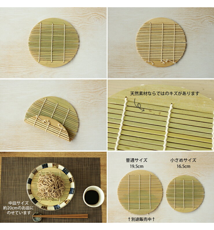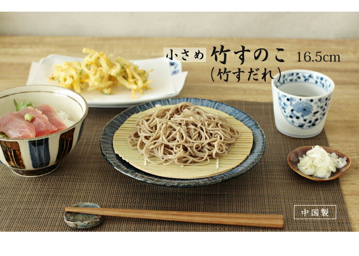 器と組み合わせ自由!少なめにピッタリサイズ ざるそば・ざるうどんに。お好きな器との組み合わせ自由で経済的。場所を取らないので収納にも困らない逸品です。業務用でもオススメです。その他に食材の水切りにも使えて便利です。こちらの小さめサイズは、定食などのミニざるそば・うどんなにピッタリサイズです。普通サイズも別途販売しておりますので、お好みでチョイスして下さい。 商品情報 サイズφ:約16.5cm 厚み:2〜3mm 材質竹(天然素材) 生産国中国 カラー竹:天然素材の色 重さ約60g ご注意●7枚までネコポスOK! (※8枚以上ご注文の場合は、メール便を選択されていても「宅配便」へ変更させて頂きます。送料が変更になりますので当店からのメールをご確認下さい。) ・天然素材りのため、ひとつひとつ木目、カラー、形、サイズに個体差があり、ささくれや 表面の剥がれ、木目、多少のヒビ、そりなどが見られることがあります。 ・簡易包装でのお届けになります。 ・1枚単位となります。 ・長時間の水の中での漬け置きは変形やカビなどの原因になりますのでご注意ください。 ・きちんと乾かしてから収納して下さい。 使用上の注意 電子レンジ 食洗機 オーブン 直火 ラッピング不可 商品の特徴※アイコンにマウスを乗せると説明が表示されます。 色むら 器ごとの色みにバラつきが生じることがございます。 特に色つきの釉薬など種類によって、個体差が出ることがございます。 器一つの中でも、色の濃淡が出るのが特徴です。 器の表情としてお楽しみください。 A品 メーカー検品で問題なしと判断された商品。 関連商品 【天然素材】 竹すのこ/竹すだれ 19.... 【民彩】 20cm 皿 / 和食器 和風... 「ネコポス」OK!【はし置き ゆらぎ3色... 藍色が美しい【花紺】 多用鉢/浅鉢 (2...