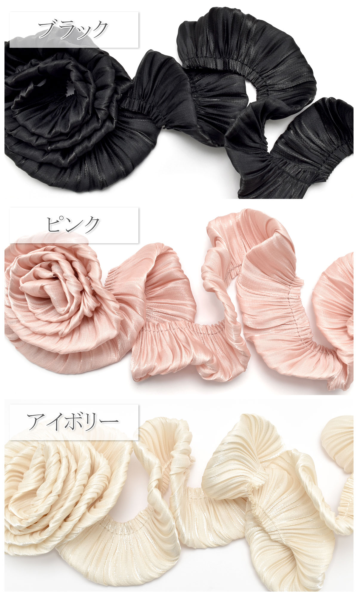 このハンドメイド用ブレードサテンリボンは、生地の表面に細かな煌めきがあり、小さなプリーツやギャザーを寄せたチューブ状デザインが特徴です。上品で大人可愛い雰囲気が魅力で、アンティークなテイストを作品にプラスしたい方にぴったりです。縫い付けたり、貼り付けて使用することで、アクセサリーやインテリア雑貨など、様々な手作りアイテムを華やかに彩ります。大人可愛いや上品なイメージが好きな方におすすめです。 カラー展開 ブラック ピンク…ややアンティークな色合い アイボリー ミルキーホワイト…アイボリーの仕様違い ややくすんだ白色調 約30mm幅リボン 10cm単位のお値段です。 オーダーカット販売です。 ・ご注文は60cmから承ります。(最低数量6) ・数量8で80cm、数量10で1mになります。 複数量お求めいただいた商品はつながった状態でお送りしますが、在庫の状況によって分かれる場合がございます。 ご注意 ※リボンは最大約8mです。入荷時期により変わります。 ※製造・輸入時による、少々のキズ・ヨゴレやほつれ、加工ムラやそれにより幅に数ミリの誤差がある場合がございます。 ※入荷時期により、色合いのバラツキ、加工具合や素材の変更、価格の変動がございます。予めご了承ください。