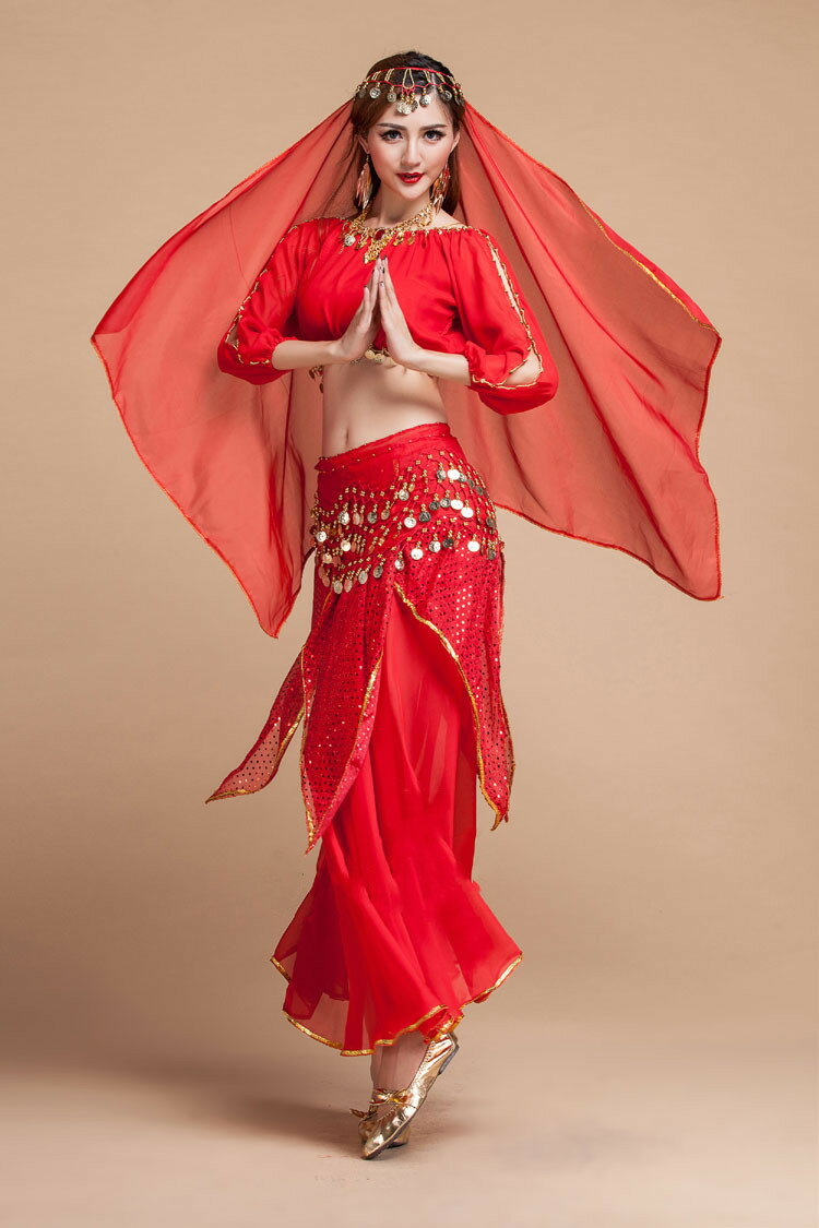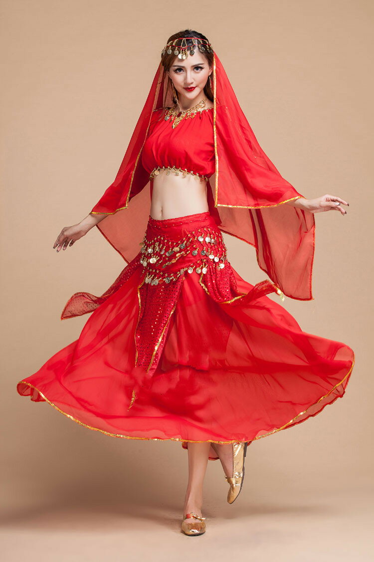 送料無料 ベリーダンス衣装 ベリーダンスセット 演出服 発表会 コスプレ イベント インド風 タンゴ ステージ レッスン着 トップス スカート ヒップスカーフ ベール4点セット 6色 楽天海外通販