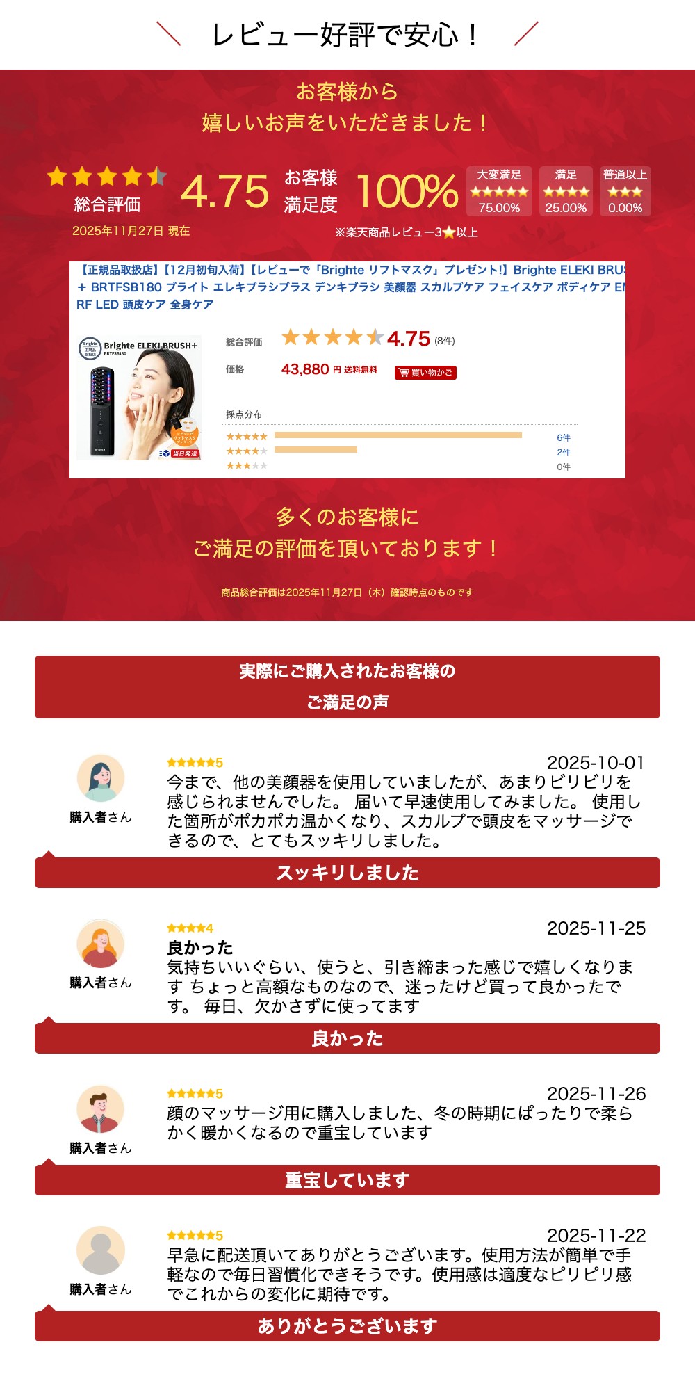 商品紹介「Brighte ELEKI BRUSH+」は、EMS、インテリジェントRF、赤色LED、青色LEDを搭載したブラシ型の美顔器です。アタッチメントの付け替えが不要で、SCALP(頭皮)、FACE(顔)、BODY(身体)の3つの専用モードをボタン一つで切り替え可能。頭皮から顔、デコルテ、腕、脚まで全身のケアにご使用いただけます。38本の電極ピンから放たれるEMSが筋肉に直接アプローチし、肌を引き締めます。また、RF(ラジオ波)が肌の深部まで温め、ハリ感のある肌へと導きます。赤色と青色のLEDも同時に照射し、肌のコンディションを整えます。IPX7の防水仕様のため、浴室での使用や本体の丸洗いが可能で、衛生的に保てます。充電式コードレスタイプで、場所を選ばず手軽にケアできるのも特徴です。ご使用の際は、化粧水やジェル、水などで肌を十分に湿らせてから、本体をゆっくりと滑らせるように動かしてください。初めてお使いになる際はレベル1からお試しいただき、お好みに合わせて5段階のレベル調整が可能です。商品名Brighte ELEKI BRUSH+ BRTFSB180ブランドBrighte(ブライト)メーカーAiロボティクス株式会社商品仕様型番: BRT-FSB180本体サイズ: H180×W47×D35mm本体質量: 約170g定格電源: 5V/2A消費電力: 最大5W充電時間: 約3時間機能: デュアルモードEMS、インテリジェントRF、赤色LED、青色LED防水仕様: IPX7生産国中国商品区分美容家電ご使用方法ご使用になりたい箇所を化粧水や水、ジェルなどで十分に湿らせます。電源/MODEボタンを長押しして電源をオンにし、短く押してSCALP/FACE/BODYのモードを選択します。LEVELボタンでEMSのレベル(1〜5)を調整します。電極ピンが肌に触れるように、ゆっくりと滑らせるように動かしてください。その他注意事項ご使用の前に必ず取扱説明書をお読みの上、正しくお使いください。初めて使用する場合や肌が敏感な場合は、必ずレベル1からお試しください。医用電気機器を使用している方、特定の疾患がある方、妊娠中の方などはご使用になれません。詳細は取扱説明書をご確認ください。使用中に異常を感じた場合は、直ちに使用を中止してください。広告文責株式会社marble関連ワードBrighte ELEKI BRUSH+ ブライト エレキブラシ プラス BRTFSB180 美顔器 ブラシ型美顔器 デンキブラシ 電気ブラシ スカルプケア フェイスケア ボディケア 全身ケア 頭皮ケア 首元ケア デコルテケア EMS RF ラジオ波 LED 赤色LED 青色LED リフトケア ハリ 弾力 引き締め もたつき 表情筋 筋肉 トレーニング 温感ケア スキンケア 美容家電 ホームケア おうち美容 防水 IPX7 お風呂 バスルーム コードレス 充電式 軽量 コンパクト アタッチメント不要 簡単操作 シンプル操作 女性 男性 メンズ レディース ユニセックス 男女兼用 ギフト プレゼント 贈り物 誕生日 クリスマス 母の日 敬老の日 ご褒美 正規品 公式 取扱店 佐々木希 Aiロボティクス 株式会社NBS 頭皮マッサージ フェイスライン 口元 目元 首 肩 腕 脚 全身 顔 頭皮ブラシ 電動頭皮ブラシ 美容機器 ホームエステ サロン級 本格ケア ヤーマン ミーゼ スカルプリフト myse YAMAN mys? SCALP LIFT アクティブ プラス MS-82G デンキバリブラシ ELECTRIC BARI BRUSH 2.0 +BODY GMコーポレーション サロニア SALONIA EMSリフトブラシ EX-160SL-JP アデランス Aderans HairRepro DoRAISE 2 ヘアリプロ ドゥライズ2 ARTISTIC&CO アーティスティックアンドシーオー Miss Arrivo THE WRAITH ミスアリーヴォ ザ レイス 比較 検討 人気 ランキング おすすめ オススメ 口コミ クチコミ レビュー 評判 話題 新型 最新モデル 関連商品【正規品取扱店】【12月初旬入荷】【レビューで「Brighte リフト...【正規品販売店】【15,000円クーポン配布中】【レビューで専用ジェル...【正規品取扱店】【15,000円OFFクーポン】【レビューで「美顔器用...44,980円54,780円58,300円【正規品販売店】【50000円オフクーポン配布中】【2年保証】【レビュ...【正規品販売店】【40000円オフクーポン配布中】【2年保証】【レビュ...【正規品販売店】【3,000円クーポン配布中】ZOGANKIN OVO...193,600円213,400円17,600円【メーカー公認販売店】【レビューで「美容液」プレゼント!】SNUVO(...【正規品取扱店】YA-MAN ヤーマン フォトプラス シャイニー ネオ...【正規品取扱店】アンファー DISM ディズム EMS EER BOT...55,000円69,300円38,720円
