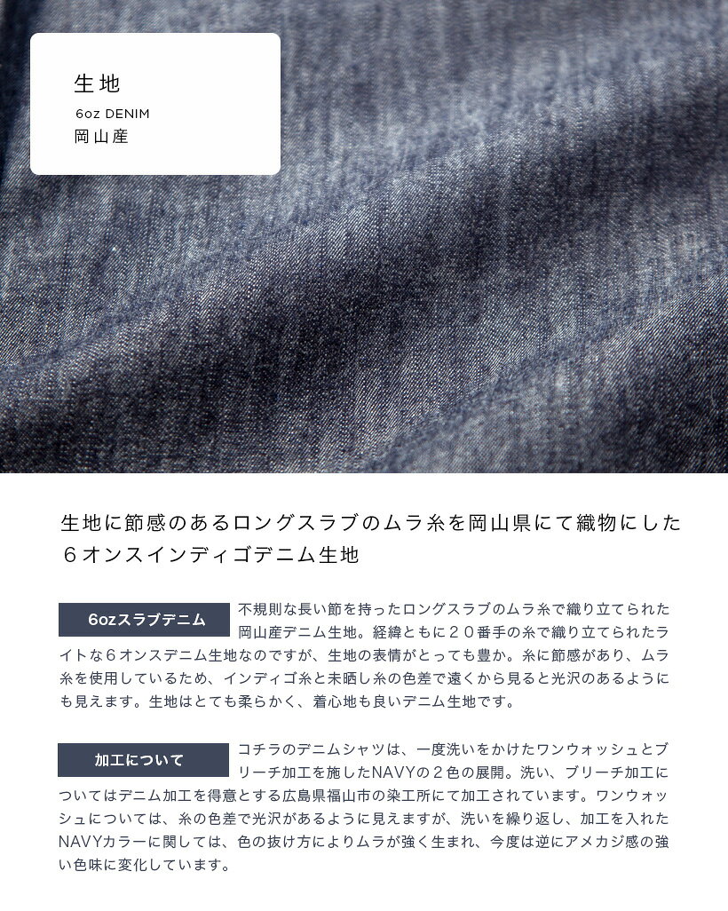 「MANUAL ALPHABET(マニュアルアルファベット)」から、クラシックなゆとりのあるサイズ感を提案するBulging Fitのボタンダウンデニムシャツをご紹介。 ◆実寸サイズ (1)/着丈後(前) 72(68)/身幅54/肩幅46/袖丈60/首周43 (2)/着丈後(前) 74(70)/身幅56/肩幅48/袖丈61/首周44 (3)/着丈後(前) 76(72)/身幅58/肩幅50/袖丈62/首周45 (4)/着丈後(前) 78(74)/身幅60/肩幅52/袖丈63/首周46 ◆モデル着用:170cm/62kgで(2)サイズ ◆素材:綿100% ◆カラー展開:ワンウォッシュ ネイビー ◆生産国:日本 クラシックなゆとりあるスタイルを提案するBulging Fitは、ルーズでリラックスしたシルエットです。 肩幅、バストにゆとりを持たせ着易さを実現しながらも品のある佇まい。着丈はタックイン/アウト共に対応できるバランスの良い長さ。 脇から袖にかけては3mm幅の織り伏せ縫い。剣ボロ裏の処理やヨーク部分の袋縫いなど大量生産では行われない細かな縫製技術が随所にちりばめられています。 素材は不規則な長い節を持ったロングスラブのムラ糸で織り立てられた岡山産デニム生地。柔らかく、生地の表情も豊か。 シャツメーカーとしてのMANUAL ALPHABETのモノづくりのこだわりが詰まったデニムシャツです。 同じシルエットのオックスフォードシャツはこちら ・メーカー希望小売価格はメーカー商品タグに基づいて掲載しています■ボトムス: have a good day ハブアグッドデイ ワイドチノパンツ ■アウター: have a good day ハブアグッドデイ タイプライターカバーオールシャツ ■ボトムス: Upscape Audience バックサテン ワイドイージーベイカーパンツ サイズの計測についてはコチラから! SIZE サイズ 着丈 後 (前) 身幅 肩幅 袖丈 首周り 1 72 (68) 54 46 60 43 2 74 (70) 56 48 61 44 3 76 (72) 58 50 62 45 4 78 (74) 60 52 63 46 商品説明 MANUAL ALPHABET(マニュアルアルファベット)から、クラシックなゆとりのあるサイズ感を提案するBulging Fitのボタンダウンデニムシャツをご紹介。 元々はシャツ専業メーカーで、現在も様々なブランドの生産を請け負ったりしているMANUAL ALPHABET。 こなれたお値段で質の高いシャツを展開しているのは、皆さんご周知かと思いますが、その中でも定番としてずっと作り続けられている製品がいくつかあります。 こちらのデニムシャツもその一つ。 そしてこの定番のシャツには、同じ素材で2つのシルエットが存在しています。 少し細めのラインに設定された「Suitable Fit」とクラシックなゆとりあるシルエットの「Bulging Fit」。 こちらはゆとりのある「Bulging Fit」。 クラシックなゆとりあるスタイルを提案するBulging Fitは、ルーズでリラックスしたシルエットです。 肩幅、バストにゆとりを持たせ着易さを実現しながらも品のある佇まい。 また身体の動きに連動するようにヨーク幅を狭く、後ろ身頃には肩の動きに沿うようボックスプリーツを入れることで肩回りの可動性も高い仕様。 着丈はタックイン/アウト共に対応できるバランスの良い長さ。 ジャケットスタイルにも一枚で着用する休日のスタイルにも着用しやすい。 縫製に関しては、ドレスシャツ専門の工場で製作されていて、随所にそのテクニックがちりばめられています。 脇から袖にかけて手間のかかった3mm幅の織り伏せ縫い。 生地どうしを本縫いで縫い合わせた後、 片方の生地端をカットし、片方の縫い代をもう片方の縫い代で包み、包んだ端にステッチをかける方法ですと説明は簡単ですが、幾度もの工程がかかり、さらに3mmの幅となると熟練の工場でも至難の技術になります。 通常では5〜10mm程度の折り伏せや、量産するには生地を重ねて巻き込む巻き縫いの方が効率が良いのですが、縫い目のパッカリング(ステッチに出るしわしわ)を防ぎ、生地の重なりで厚みがでるのを防ぐため、美しい脇線の仕上がりに。 剣ボロ裏は生地端のボロが出ないよう工夫し、袖を折り返した時も表との違和感のない美しさを表現しています。 肩のヨークに関しても大量生産では行われない細かな縫製技術が。 通常であれば外側から押さえの縫製が見えてしまうのですが、これをコンストラクションヨークという外側に縫い目が見えない袋縫いで仕上げられています。 ボタンには上品な光沢のある国産の高瀬貝に刻印をいれたMANUALオリジナルボタンを使用し、 指馴染みが良く付け外しやすい厚み。 使用している素材は、不規則な長い節を持ったロングスラブのムラ糸で織り立てられた岡山産デニム生地。 経緯ともに20番手の糸で織り立てられたライトな6オンスデニム生地なのですが、生地の表情がとっても豊か。 糸に節感があり、ムラ糸を使用しているため、ONEWASHではインディゴ糸と未晒し糸の色差で遠くから見ると光沢のあるようにも見えます。 洗いを繰り返し、ブリーチ加工を入れたNAVYカラーに関しては、色の抜け方によりムラが強く生まれ、今度は逆にアメカジ感の強い色味に変化を。 洗い、ブリーチ加工についてはデニム加工を得意とする広島県福山市の染工所にて加工されています。 生地はとても柔らかく、着心地も良いデニム