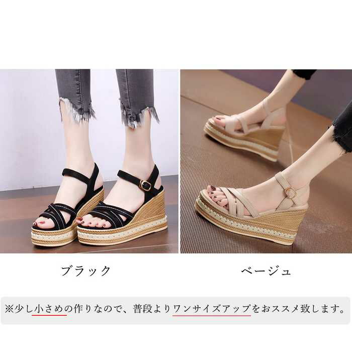 商品について 安定感があり疲れにくく、足をキレイに魅せてくれるウェッジソールサンダルソフトで足当たりの良いクッションインソールで足の疲れを軽減し、優しく快適でふわふわな履き心地!ボリュームのあるヒールも見た目軽やかな印象に仕上がり!夏らしい爽やかな雰囲気がGOOD♪ストラップで足をしっかり固定できるので歩きやすく、フック式で脱ぎ履きも楽チンキレイなシルエットで足を華奢に見せてくれる、ナチュラルな夏らしさを演出 詳細データ 甲素材:合成皮革底素材:合成底カラー:ブラック/ベージュサイズ:22.5cm(35)/23.0cm(36)/23.5cm(37)/24.0cm(38)/24.5cm(39)(カッコ内は靴底表記となります)[22.5]長さ:約22.5cm 幅:約8.0cm ヒール:約8.0cm[23.0]長さ:約23.0cm 幅:約8.2cm ヒール:約8.0cm[23.5]長さ:約23.5cm 幅:約8.4cm ヒール:約8.0cm[24.0]長さ:約24.0cm 幅:約8.6cm ヒール:約8.0cm[24.5]長さ:約24.5cm 幅:約8.8cm ヒール:約8.0cm重さ(両足):約492g-518g生産国:中国 ATTENTION ※すべて平置きサイズです(採寸方法違いより、多少の誤差がございますので、ご了承ください)。※海外輸入品のため、商品の細部仕様は多少異なる場合がございます。予めご了承の上、ご注文お願い致します。※商品写真は、 お使いのモニターや外部環境により、実物とは色味や質感が異なる場合がございます。予めご了承くださいませ。