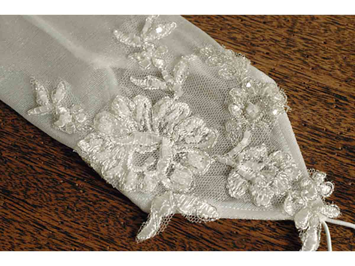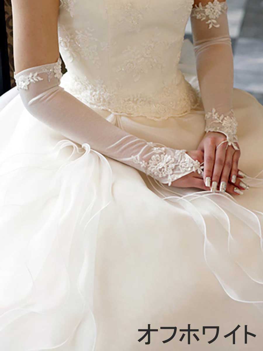 関連の商品⇒ ★違うレースモチーフのグローブ [G54]⇒ ★長さ2.8m日本製チュールメロウベール [Y03]⇒ ★長さ3mインポートチュールパイピングベール [V52]商品の説明人気のフィンガーレスグローブ(ロング)です。POINT → リング交換もグローブを外さずにできるので、式の進行がスムーズに行くメリットもあります。式は通常のグローブで、披露宴にはフィンガーレスで手元の印象をチェンジという使い方もお勧めです!グローブ専門メーカーの日本製フィンガーレスグローブに、イングランドより輸入したビーズ加工レースをプラスした、オリジナル商品です。制作は国内自社アトリエにて行っています。商品のバリエーションオフホワイトとアイボリーの2色ご用意。ウエディングドレスに合わせてお選びください。サイズデータゴムの輪は中指に引っ掛け、そこから40cmのレングスとなります。伸縮性のあるタイプですので、腕にフィットします。素材ナイロン100% ストレッチオーガンジー(ストレッチタイプ)控えめの光沢があります。取り扱いについてグローブの生地やレースは繊細なものですので、場合によっては少しのひっかかりなどでも、糸ひけなどが発生する場合もございます。お取り扱いに気をつけてください。おすすめレビュー花嫁支度♪ ★★★★★5超キレイ!!刺繍も細かくて、本当にすばらしい作りです!シャンパンっぽい色がとても愛らしくてステキです。心配だったのが、ドレスの色と合うかどうか・・・ってところでした。が、昨日小物合わせに持参したところバッチリでした☆SHOPの方が「え〜!?全く同じファブリックでウチが作ったんじゃないの!?」とビックリされていました。しかも、こんなにこったデザインのグローブは見たことないと・・・(^ー^)v チョット自慢でしたよ!(笑)−−−−−追加コメントつい先日、挙式を終えました!!。当日のメイクさんにも「ステキなめずらしいグローブぅ♪」とお褒めの言葉をいただきました☆写真うつりも本当によくて、おすすめできるアイテムですよ!!⇒ この商品のレビューページはこちら(検索キーワード:ウエディンググローブ/ロンググローブ/フィンガーレスグローブ/レースグローブ/オーガンジーグローブ/ウエディングドレス/ウエディング/ウェディング/ブライダル/花嫁/新婦/挙式/結婚式/パーティー/花嫁グローブ/オフホワイト/アイボリー/海外ウエディング/リゾートウエディング/ホテルウエディング/二次会/2次会/1.5次会/前撮り/花嫁小物/ウエディング小物/ウェディング小物/ Wedding/Bridal/ギフト/プレゼント/即日発送/インスタ/インスタグラム)ブライダル専門店ヴィーヴ・ラ・マリエ!自社製・オリジナルウエディンググローブです!(ロンググローブ・フィンガーレスグローブ) 手元をエレガントに演出してくれるフィンガレースグローブ。今当店でも一番の人気商品です。せっかくのネイルアートも通常のグローブでは隠れてしまいます。フィンガーレスグローブなら手先が隠れないので、ネイルアートも綺麗にみえます。▼色オプションのご選択の参考に、比較写真をご用意しました。ご参照ください。⇒ カラーの比較写真
