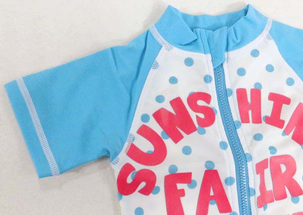 ・UVPROTECT/SUN BLOCK 紫外線から大切なお子様を守ります! ・ファスナーを上下させる際に皮膚や生地を噛む ことがあるのでご注意ください。 挟まないように、ガード生地は付いています! ・フード付きラッシュガード ・ネームタグ付き 総柄部分 ポリエステル90%・ポリウレタン10% 無地部分 ナイロン82%・ポリウレタン18% ○UVプロテクト SUNブロックで、紫外線からお子様のお肌を守ります。 ---------------------------------------- 【配送につきまして】 メール便で発送します。 遅延・紛失・破損 の補償が ございませんのでご了承ください。 ◆メール便はポストに入らない場合や表札と異なるお名前、 居住登録のないお名前の場合は投函せず返送と なりますのでご注意ください。 通常の宅配便での発送をご希望の場合は 備考欄に【宅配便希望】とご記入ください。 楽天市場からの自動配信メールには送料無料と なっておりますが、当店にて通常送料加算いたします。 [他の商品と同梱の場合] メール便の許容範囲(3辺60cm、厚み3cm)を超えた場合は 通常送料がかかります。 ご注文時には送料無料となっている場合がございますが 宅配便送料を加算いたします。 その場合は送料加算のご連絡をさせていただきます。 ※ご注文時に送料欄が宅配便送料となっている場合は そのまま発送いたします。 送料について不安な方はメールにて お問合わせください。 商品の発送後に発送方法の変更は出来ませんので ご了承ください。 【ラッピング包装不可】 ※実際の商品の色とパソコンのモニター画面上では 多少色味が異なって見える場合があります。 ご了承ください。 ----------------------------------------