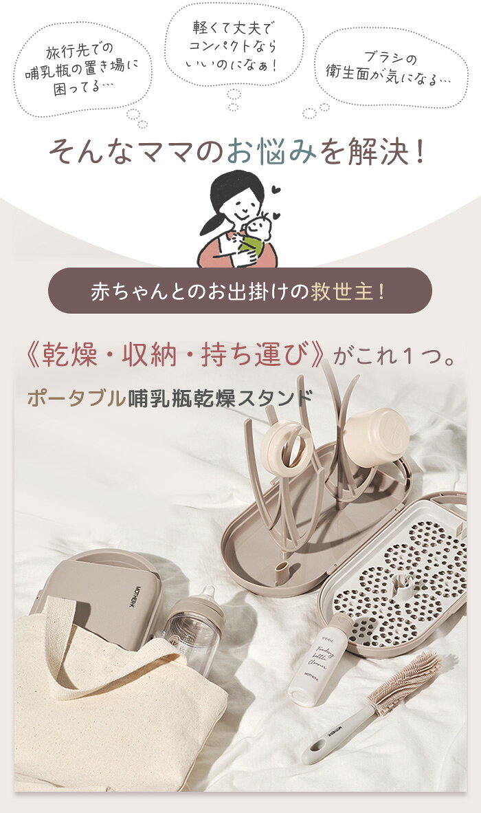 商品名 ポータブル哺乳瓶乾燥スタンド ブランド マザーK 生産国 中国 素材 本体:ABS樹脂 ミニ哺乳瓶ブラシ(ハンドル):ポリプロピレン ミニ哺乳瓶ブラシ(ブラシ):シリコンゴム 洗剤詰め替え容器:ポリエチレン 商品詳細 *赤ちゃんとのお出掛けの救世主!哺乳瓶の《乾燥・収納・持ち運び》がこれ一つで叶う「ポータブル哺乳瓶乾燥スタンド」。 *洗った哺乳瓶を乾燥させるのに便利な哺乳瓶スタンドです。 *コンパクトに収納できるので、マザーズバッグに入れて旅行や帰省、お出かけにも。 *重さは約380gと軽量!持ち運びに便利なミニマルサイズ。 *持ち運びに便利なハンドル付きで、機内持ち込みもOK! *お手入れに必要なミニ哺乳瓶ブラシ・洗剤詰め替えボトルが付属。ケースの中にまとめて収納できるので、持ち運びもラクラク。 *簡単に組み立て・分解できるので収納に困らず、外出先でもご自宅でも便利にご使用いただけます。 *乾燥スタンドの先端は、丸みが付いていて哺乳瓶などへ傷が付きにくい安心設計。 *専用ブラシも立てられます。 *哺乳瓶以外にも、ステンレス製マグやおしゃぶり、歯がためなども乾燥できます。 *軽くて丈夫なACBS素材を使用。赤ちゃんに安全な素材なので安心してご使用いただけます。 《乾燥できるもの》 1.魔法瓶、ガラス製など重さのあるもの:2つ 2.プラスチック製の哺乳瓶:4つ 3.その他、おしゃぶり・歯がためなど セット内容 【本体】 ・物干しラック本体 ・哺乳瓶乾燥ラック2個 ・水切りスタンドホルダー 【付属品】 ・ミニ哺乳瓶ブラシ ・洗剤詰め替え容器 注意事項 食洗器・電子レンジなどでの消毒使用は、商品変形リスクがあるためご遠慮ください。 持ち運びの便利を最大化した商品であるため、ガラス製の哺乳瓶3つ以上を乾燥させると倒れたり、折れたりする可能性があるので、乾燥しすぎにはご注意くださいませ。 サイズ サイズ(cm) (組立前):26.7×14.3×5.7cm 重量 約380g ※実際は上記の実寸を参考にしてお手持ちのアイテム等と比較してご検討下さい。 ※表示寸法は目安となっております。実際の商品の寸法とは若干差がある場合がございます。ご了承ください。 配送方法 ※送料無料発送になります。 ※沖縄・離島は送料無料でも送料(手数料込)を別途いただく場合がございます。予めご了承下さい。 ※韓国から梱包された状態で届く為、検品時に開封をいたしますが予めご了承ください。※星月柄マザーズバッグはこちら ※星月柄マザーズバッグはこちら お出掛けに便利なマザーズバッグも好評販売中! *商品の画像につきましてはあくまでも商品の一例としての掲載画像もございます。 *ご注文のサイズによりましては写真と実際の商品のイメージが異なる場合がございます。 *イメージ違いの場合は交換・返品の際に往復の送料、手数料をご負担頂く形となっており ますのでデザイン等気になる商品に関しましては必ずお問い合わせをお願い致します。