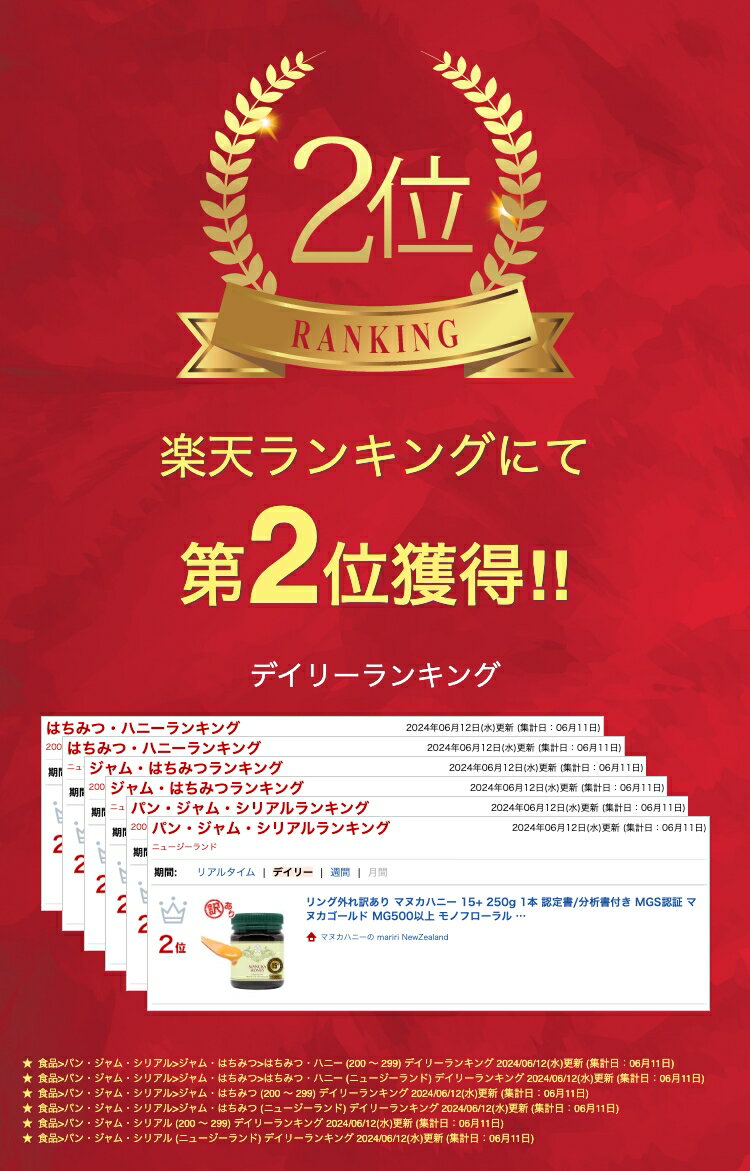 原材料 マヌカハニー 保存方法 生蜂蜜ですので、お手元に届きましたらすぐに包装をあけていただき、直射日光・高温多湿を避け、冷暗所で保存してください。 賞味期限 商品に記載よくあるご質問:賞味期限の確認方法について 原産地 ニュージーランド ご注意ください ※1歳未満の乳児には与えないで下さい。 ※ラベルデザインなど多少変更になる場合があります。 ※寒い季節には、ハチミツが白っぽく結晶化することがありますが、自然に発生する現象であり、品質に変わりはありません。よくあるご質問はコチラ≫ 輸入販売者(広告文責) マリリニュージーランド(株)0133-26-4183北海道石狩郡当別町スウェーデンヒルズ2367-9 関連商品訳あり マヌカハニー 12+ 250g 1本 認定書/分析書付き MG...延長!【さらにクーポンで5%OFF!〜11/20/11:59まで!】期...延長!【さらにクーポンで5%OFF!〜11/20/11:59まで!】期...3,200円3,780円3,890円マヌカハニー with プロポリス 250g 1本 MG100+ はち...訳あり マヌカハニー 8+ 250g 1本 認定書/分析書付き MGS...マヌカハニー with プロポリス 250g 1本 MG100+ はち...3,450円2,480円3,450円【冬の喉に安心の一粒!】マヌカハニー キャンディー ロゼンジ 3箱 【...訳あり マヌカハニー 12+ 500g 1本 認定書/分析書付き MG...【期間限定価格】マヌカハニー UMF10+ が2890円 250g 1...3,300円6,200円2,890円マヌカハニー MG200以上 (MGS8+相当) 250g 1本 Ra...マヌカハニー UMF10+ 500g 1本 UMF協会認定 MG261...延長!【さらにクーポンで5%OFF!MGO200プラス! モノフローラ...3,100円4,500円2,890円