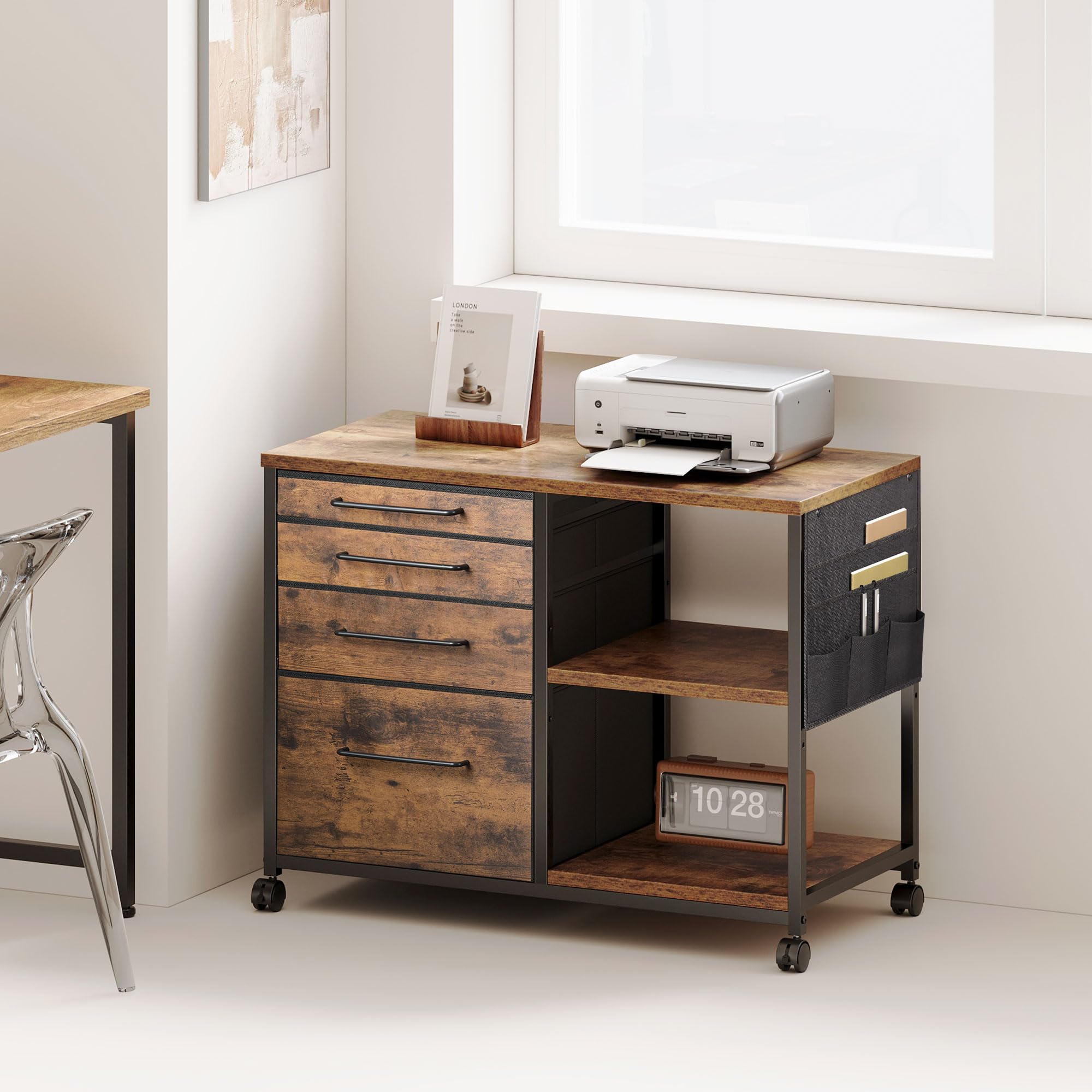【送料無料】YeTom サイドキャビネット デスクワゴン 布製 袖机 層板付き サイドワゴン 4段 オフィスワゴン A4対応 プリンター台 大容量 キャスター付き デスク下収納 幅750*奥行400*高さ650mm ビンテージ