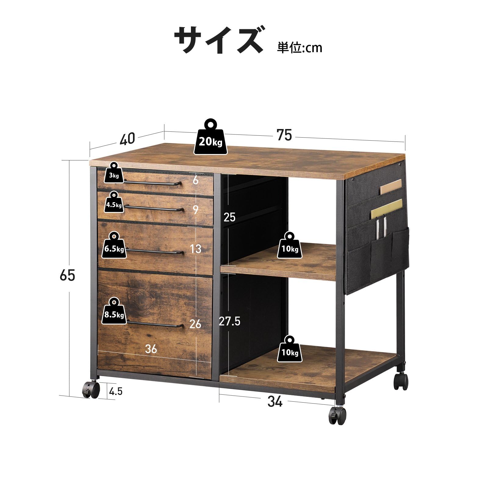 商品情報商品の説明主な仕様 【大容量収納】引き出しが4段付き、用途で使い分けられるので細かいファイル整理が可能です。引き出しの深さを上から下へと増やしていくことで、モノごとの収納ニーズを満たすことができます。以前のキャビネットより高さを調節できるレイヤが多くなっているので、高い本や書類を置くことができます。br【使い勝手抜群】デスクの横でサイドワゴン、ホームオフィスのデスクワゴン、ソファの周りでサイドテーブル、ベッド脇ではナイトテーブル、ダイニングやキッチンでキャビネットとして、様々なシーンで活躍します。br【移動便利】引き出しの取材がオックスフォード布と不織布なので、サイドワゴン全体がとても軽く、移働に便利なキャスターがついています。手軽に移動ができますので、レイアウトの変更や掃除の際も簡単に移動ができます。また、ストッパーが付いているので、引出しを開ける度にワゴンが一緒に動いてしまったり、転倒したりすることはありません。br【温かみのあるデザイン】布制のキャビネットに金属のシンプルな取っ手と質感のある木制の天板を組み合わせました。シンプルなデザインと落ち着いた色合いで、単体の使用でも違和感なくインテリアになじみます。オフィスや寝室、リビングなど、さまざまな場所で使用できます。br【商品仕様】商品外寸:幅750*奥行400*高さ650mm。本体重量:10kg。耐荷重:天板10kg、上段10kg、中段10kg*2、下段10kg、階板10kg。素材:合成樹脂強化合板、オクスフォード。※ご注意※お客様組立商品。天板は引き出しとラックに分かれていますが、幅によって穴の位置が4センチずれていますので、間違えないようにご注意ください。