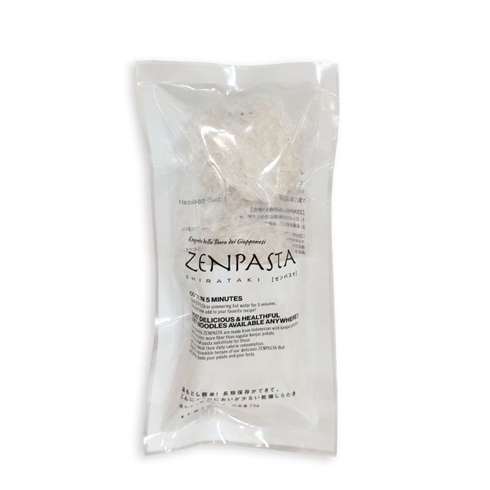 日本生まれ、イタリア育ちの乾燥しらたき「ゼンパスタ」の元祖。こんにゃくの臭みがまったくないヘルシーパスタ。プリッ、とした独特の食感が人気の秘密です。 [内容量] 75g(3個入) [原材料] 水あめ、タピオカでんぷん、こんにゃく粉/水酸化カルシウム(こんにゃく用凝固剤)、クエン酸 [調理方法] 約5分、熱湯で湯戻ししてください。 [栄養成分/1パックあたり湯戻し後]エネルギー84kcal、糖質18g ※1パック75gは、湯戻し後180gまで膨れます。