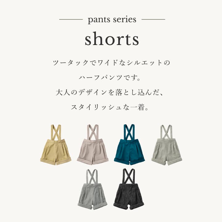 アイテム詳細 商品説明 ツータックでワイドなシルエットのハーフパンツです。大人のデザインを落とし込んだ、スタイリッシュな一着。 カラー usuki/kurumizome/asagi/beige/grey/charcoal 素材 usuki/kurumizome/asagi素材:綿97%,ポリウレタン3%beige/grey/charcoal表生地:ポリエステル56%、アクリル23%、羊毛9%、レーヨン5%、その他7%裏生地:ポリエステル79%、綿21% サイズ ウエストゴム上がり:54cm股上:21cm股下 ( 伸ばした状態 ):15cm肩紐長:〜56cm※推奨年齢は個人差がございますので、実寸を参考にしてください 対象年齢 推奨年齢:1〜6歳 お手入れ方法 usuki/kurumizome/asagi・洗濯機可(ネット使用・タンブラー乾燥不可)・色移りする事がありますので、淡色のものと分けて洗ってください。・洗濯の際は付属とは別々に洗濯して下さい。・アイロンの際は当て布をご使用ください。・形を整えて陰干しして下さい。・濃色は色落ちすることがあります。beige/grey/charcoal・家庭での水洗いはお避け下さい。・ボタンに直接アイロンを掛けないで下さい。・アイロンの際は当て布をご使用ください。・濃色は色落ちすることがあります。・この製品は、直射日光等により退色する事がありますので、お取扱いにはご注意下さい。 生産国 中国
