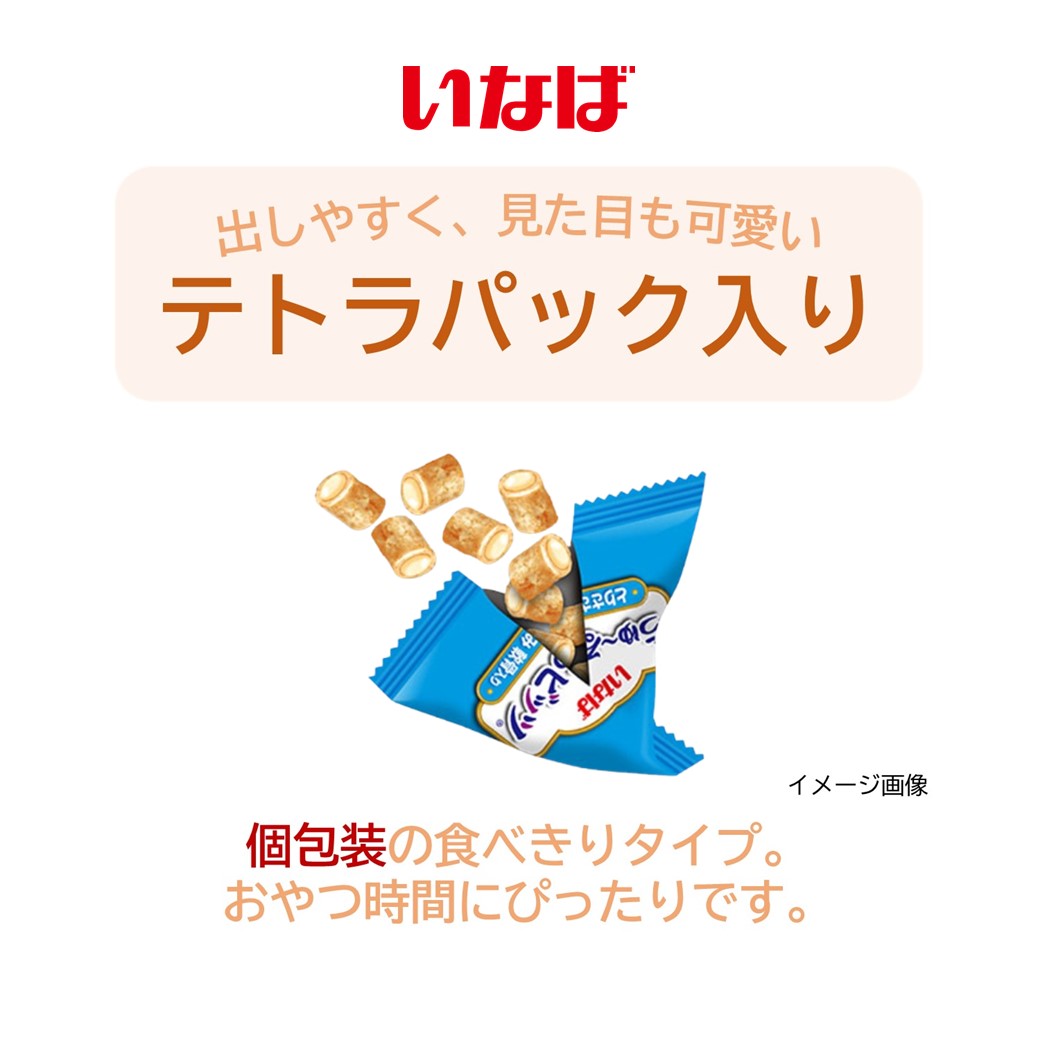 [商品サイズ(mm)]130×60×210[単品重量(g)]48 [エネルギー]約20kcal/袋[栄養成分]たんぱく質21.0%以上、脂質4.2%以上、粗繊維0.1%以下、灰分2.0%以下、水分72.5%以下[原材料]鶏肉(ささみ)、鶏脂、かつお節、鶏軟骨、チキンエキス、ガラクトオリゴ糖、寒天、卵白粉末、酵母エキス、増粘安定剤(増粘多糖類、加工でん粉)、ビタミンE、紅麹色素、緑茶エキス[商品説明]2つの食感が楽しめるおやつ。[使用方法・給与方法]愛犬の体重に応じて下記表を目安におやつとしてお与えください。3kg:2袋/日、5kg:3袋/日、8kg:4袋/日、10kg:5袋/日。[使用上の注意]鶏ささみ由来の成分が黒く変色することがありますが、品質には問題ありませんのでご安心ください。[お手入れ・保管方法]お使い残りの出た場合は、他の容器に移し替えて冷蔵庫に入れ早めにお与えください。[原産国]日本[製造販売]いなばペットフード株式会社〒550-0001大阪市西区土佐堀1丁目3-20 三菱重工ビル2階JAN:4901133682469