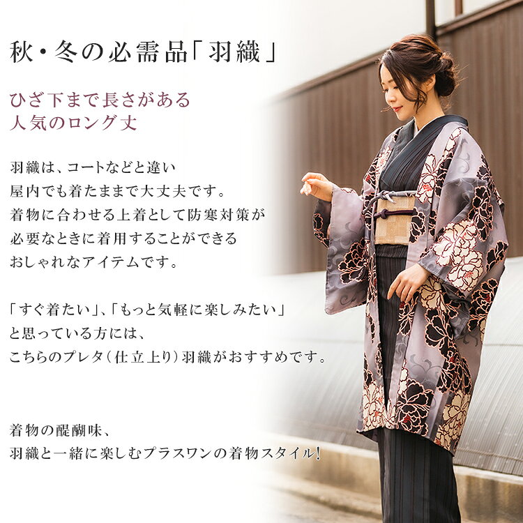 春・秋・冬に着られる 仕立て上がり 洗える長羽織 〜クラシックモダン シリーズ〜 ちょっと長めで美しく見える 大人の女性らしい優雅さのある長羽織です。 羽織は、コートなどと違い 屋内でも着たままで大丈夫です。 着物に合わせる上着として防寒対策が必要なときに 着用することができるおしゃれなアイテムです♪ 【おすすめポイント】 ◎ちょっと長めでオシャレ感いっぱいの長羽織。 ◎滑りが良く、シワになりにくい生地で、長時間椅子に座ってもシワになる心配がありません! ◎羽織には共布の紐が取り付けてあります。 取り外しが可能なので、お手持ちの羽織紐を合わせてご使用することもできます。 ◎室内外問わず、スラリとレトロモダンなオシャレが楽しめます。 ◎仕立て済なので、商品が届けばすぐに羽織れます。 ◎自宅で手軽に丸洗いができる素材なので、お手入れも簡単です。 商品内容 女性用 袷長羽織(共布の羽織紐付き) 単品 色柄詳細 No.1グレー地に牡丹柄 (紗綾型地紋が入った少し青みのあるグレー色のぼかし地に薄クリーム色と黒色の牡丹柄) No.2茶鼠色地に雪輪椿柄 (紗綾型地紋が入った茶みのある鼠色地に大輪の雪輪と椿柄) No.3黒褐色地に四季草花柄 (焦げ茶がかった黒地に霞と四季の草花(松・竹・梅・桜・菊)柄) No.4クリーム地に流水唐花柄 (明るい薄い黄色地に優雅な流水と唐花柄) No.5黒地菊と葡萄柄 (紫・緑・青色のグラデーションが入った黒地にカスレ風の菊と葡萄柄) サイズ(単位cm) フリーサイズ 身丈:約98cm 裄:約68.5cm 袖丈:約47cm 肩巾:約34cm 適応身長:155〜170cm ※合わせるお着物の裄より、羽織の裄の方が長いものをお選びいただくのがおすすめです。 素材・品質 ポリエステル 100% 着用時期 春・秋・冬のスリーシーズン 袷・単衣着物の時期(1〜6月、9〜12月) ※気温の体感は個人差がございますので、体調等に合わせてご調節下さい。 着用シーン 普段のお出かけ、お茶会、お食事会や芸術・映画鑑賞などのカジュアルなシーンに お手入れ ●丸洗いができます。 ●洗濯機をご使用の場合は洗濯ネットに入れ、一枚ずつ弱水流で3~5分、丸洗いします。洗剤は中性洗剤をご使用ください。 ●すすぎ洗いは3〜5分程度、すすぎ後は水から引き上げ、形を整えたら、脱水せずそのまま「ダラ干し」してください。 ▼着物用洗濯ネットもご用意しています。 →かわいい洗濯ネットはこちら ▼着物用洗濯ネット&着物ハンガーのセットもご用意しています。 洗濯後やご着用後に着物用ハンガーがあると便利です。 →かわいい洗濯ネット&着物ハンガーセットはこちら おすすめ関連商品 ▼ほかの羽織・コートをチェック →羽織・コートコーナー ▼羽織紐をチェック →羽織紐コーナー ▼あわせる袷着物をチェック →仕立て済の袷着物コーナー ▼あわせる単衣着物をチェック →仕立て済の単衣着物コーナー ▼保管グッズをチェック 湿気から着物・羽織・コートを守ってくれる「たとう紙」 →着物たとう紙 単品 →着物ガート・着物たとう紙2点セット ※画像は可能な限り商品のお色目に近づけておりますが、 モニター等の環境により誤差が生じる場合がございます。 ※海外発送の場合は送料無料の対象外となります。 予めご了承くださいませ。 出品担当:呂
