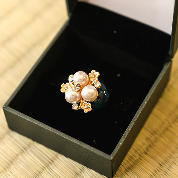 《帯留の使い方》 三分紐(さんぶひも)という細めの帯締めを通して使います。 三分紐は結んだら背中にくるっと回し、結びめはお太鼓の中に入れて隠しておきます。 浴衣帯に合わせたり、名古屋帯と合わせたり、 カジュアルなシーンでコーディネートをお楽しみいただけます。 詳細 深い青緑のマーブル模様の楕円形土台に花の形にデザインされたパールとビーズのキラキラ輝くパーツがついています。 動く度に輝き、帯周りを華やかにしてくれます。 サイズ 飾り部分→横:約2.5cm、縦:約2.5cm高さ約2.5cm(帯留金具含む) 帯締めを通す部分内径 横約1.2cm×高さ約0.3cm 化粧箱に入れてお届けします。 ※箱サイズ縦約6.5cm×横約6.0cm×高さ約3.2cm ※画像の三分紐はコーディネート例です。お届けする商品は帯留めのみとなります。予めご了承くださいませ。 おすすめ関連商品 ・他の帯留を探す→帯留コーナー ・帯留を合わせる三分紐を探す→三分紐コーナー ※画像は商品のお色目に近づけておりますが、モニター等の環境により、誤差が生じる場合がございます。予めご了承くださいませ。 ※海外発送の場合は送料無料の対象外 となりますのでご了承ください。 出品担当 亀山