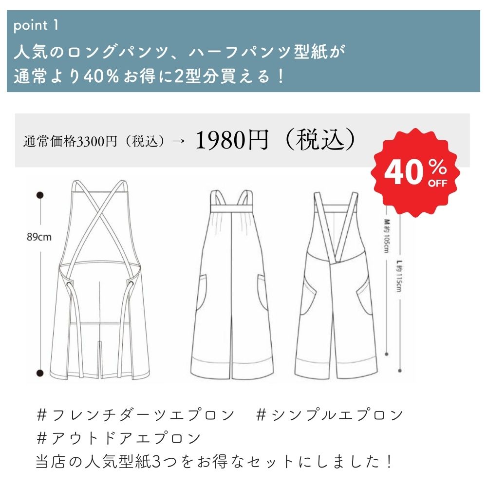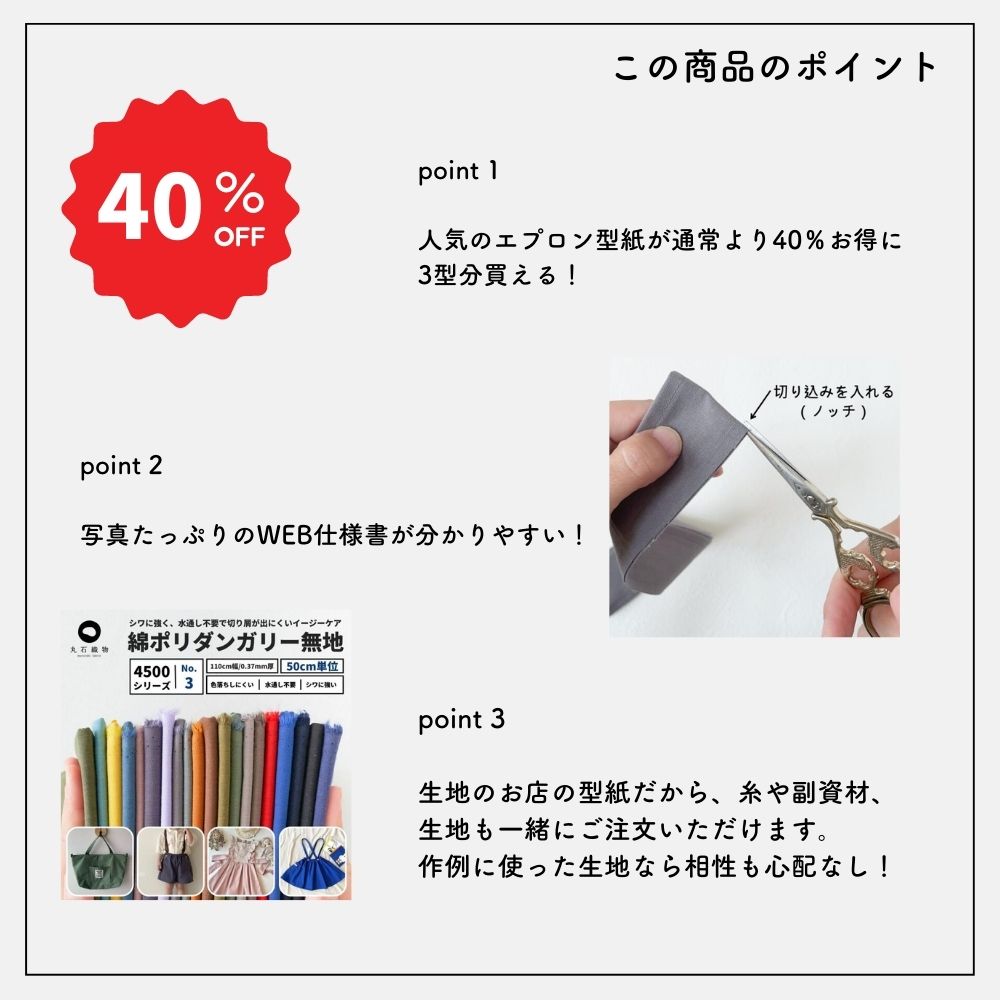 ■商品について お得な型紙のアソートパック 人気のエプロン型紙をまとめてお得に! 通常価格3,300円(税込)のところ 40%オフの1,980円(税込)で販売いたします。 初めての洋裁にもおすすめ。 すべての型紙が商用可能。 ぜひお試しくださいませ。 ※仕様書は紙の仕様書はなく、WEB仕様書のみです。 紙よりもたくさん写真を掲載できるので仕様書の絵が 苦手な店長石井は紙より分かりやすいと思っています。 メール便 個数4(4セット)まで セット内容 5-002 フレンチダーツエプロンの型紙 M・L2サイズ入り5-006 綿ポリダンガリーと相性の良いエプロン型紙5-011 男女共用アウトドアエプロンの型紙各1ずつ 型紙詳細 5-002 フレンチダーツエプロンの型紙の詳細はこちら 5-006 綿ポリダンガリーと相性の良いエプロンの詳細はこちら 5-011 男女共用アウトドアエプロンの詳細はこちら 使用する副資材 ■5-011 男女共用アウトドアエプロン 21mmハトメ2組入 アンティークゴールド アンティークカシメ9mm15組・打ち具セット 関連商品 その他のお得なアソートパックはこちらその他の型紙はこちら 作り方ページ Google「縫いナビ フレンチダーツエプロン 縫いナビ 簡単シンプルなエプロン 縫いナビ 男女兼用アウトドアエプロン」で検索してくださいね♪当店の全ての生地はこちらから