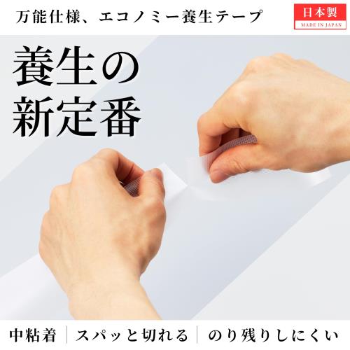●エコノミー養生シリーズに新登場。クリア(半透明)タイプで使いやすさ向上! ●カラー: 白(半透明) ●サイズ: 幅50mm × 長さ25m 厚み: 0.14mm ●素材: PETクロス+PEラミネート+アクリル系粘着剤 ●粘着力: 中程度の万能タイプ。表面を傷つけずに簡単にはがせます ●用途: 内装養生、台風防災(ガラス飛散防止)、引っ越し用仮止め、キッチンや家庭でのメモ・付箋代わり、包装封止め、工作やDIYに ●特徴:・手でスパッと切れて、軽くて使いやすい。 ・PET+PEラミネート+アクリル粘着剤の三層構造でしなやかで丈夫。 ・のり残りしにくい専用設計。(長期貼付け、高温多湿、直射日光での使用にはご注意ください) ・どこでも手軽に付箋、メモ代わりに。 油性マジックで字が書けます。 ・台風時のガラス飛散防止などの災害備蓄やちょっとした補修、仮固定用にも最適 ●エコノミー養生テープは、幅広い用途に対応する養生テープ。三層構造のフィルムクロス基材で、しなやかながら簡単に手で切れる。家具や壁、床の保護に。塗装作業や台風時のガラス飛散防止にも。のり残りしにくい専用設計で、仕上がりも美しく。白(半透明)で、自然に馴染み、見た目を損なわずに作業が可能。日常のメモ代わりとしても。家庭やオフィス、災害時の備蓄としても最適。
