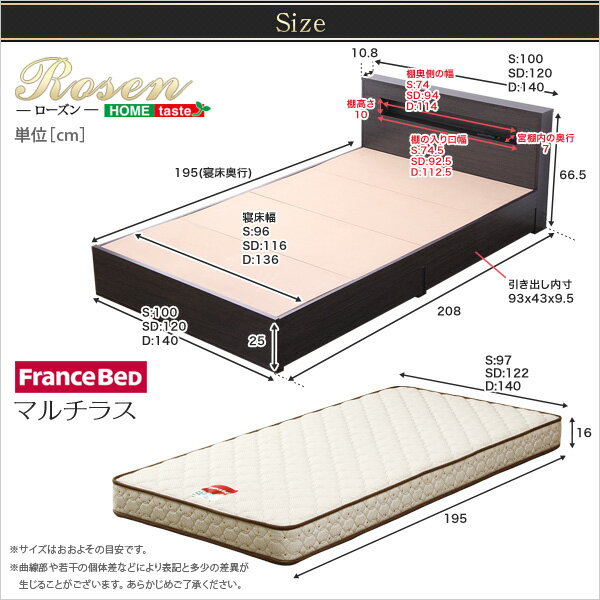 【商品について】宮、照明付きチェストベッド【ローズン-ROSEN-(シングル)】(マルチラススーパースプリングマットレス付き)■サイズ:(本体)(約)幅100x奥行208x高さ66.5cm (マットレス)(約)幅97x奥行き195x高さ16cm (約)17kg■カラー:ブラックオーク■素材:(本体)パーチクルボード、MDF、表面材:プリント紙化粧合板(マットレス)側地:ポリエステル60%、綿20%、レーヨン20%中材:マルチラススプリング、パームパッド、ウレタンフォーム、フェルト、樹脂綿、不織布■その他:・お客様組立商品です・梱包サイズ:(本体)(1-3)(約)113.4x33.4x18.5cm(2-3)(約)103.3x55.3x11.5cm(3-3)(約)104.5x72.4x18.8cm(マットレス)(約)98x196x17cm(12才)(約)18kg※在庫状況や返品などについて こちらの商品はメーカー直送商品となります。ご注文いただいてからメーカーへ在庫確認をいたしますので、 ご注文した後にメーカーに在庫がない場合は、予めご了承くださいませ。 また、発送後のキャンセルや返品をお受けすることは出来かねます。 ※送料について 北海道・沖縄・離島については、別途送料お見積りとなります。 ご購入前に、当店にお問い合わせくださいませ。 こちらの商品は「代引き不可」「同梱不可」となっております。 納品書は同封しておりませんので、何卒ご理解下さいませ。