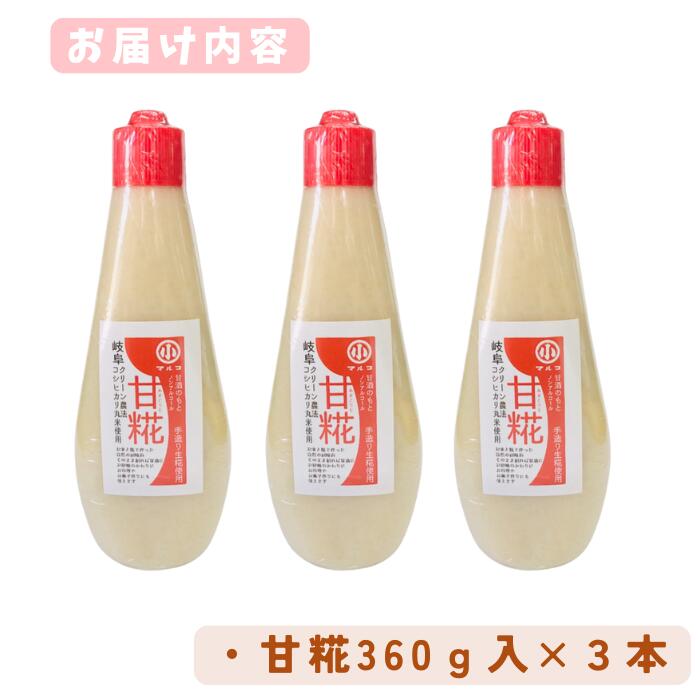 【発酵食品・自然な甘み】甘糀 甘酒の素 チューブタイプ 360g×3本セット 岐阜県産コシヒカリ100%使用|無添加・ノンアルコール・砂糖不使用|マルコ醸造 ◆ 原料は“米だけ”──シンプルで贅沢な甘み ◆ 使用している米麹もマルコ醸造が自社製造。 原材料は「米麹・米」ですが、もともとの原料はすべて岐阜県産コシヒカリの丸米のみ。 添加物・砂糖・アルコール不使用。自然の力だけで引き出した、まろやかな甘さです。 ◆ チューブ入りで使いやすく、無駄なく ◆ 必要な分だけ絞って使えるチューブタイプ。 開封後も衛生的で保存しやすく、毎日の料理やドリンクに手軽に活用できます。 甘味がしっかりしているので、冷たい甘酒でも味がぼやけず美味しい! ◆ 「飲む点滴」と呼ばれる栄養豊富な甘酒の素 ◆ ノンアルコールだから、お子様や妊婦さんにも安心。 疲れたときや体調不良時にも、すっと吸収されて元気に。 発酵食品を日常に取り入れたい方にぴったりです。 ◆ 使い方いろいろ!毎日の発酵生活に ◆ ・水やお湯で1.5〜2倍(お好みの量)で希釈して甘酒として ・ヨーグルトやアイスにかけて自然な甘みをプラス ・煮物や炒め物の隠し味に ・パンやクラッカーに塗って発酵スイーツ風に ・味噌と合わせて「甘糀味噌だれ」に ・ドレッシングやソースの甘み付けにも こんな方におすすめ! ・発酵食品にこだわる方 ・無添加・自然派の甘味料を探している方 ・料理やお菓子作りに使える甘酒を探している方 ・お子様や妊婦さんにも安心して使える甘味料を求めている方 70年以上守り続ける、伝統の糀づくり。 岐阜の米と職人の技が生んだ、やさしい甘さをぜひご家庭で。 商品情報 名称 甘糀(甘酒の素) 原材料名 米麹、米(いずれも岐阜県産)※米麹も自社製造 内容量 360g×3本セット 賞味期限 製造日より6カ月 保存方法 10℃以下で保存(クール便) 製造者 マルコ醸造株式会社岐阜県恵那市明智町732-1TEL.0573-54-3188 栄養成分表示(100gあたり)※推定値 エネルギー 203kcal たんぱく質 4.3g 脂質 0.2g 炭水化物 45.8g 食塩相当量 0g 【発酵食品・自然派志向の方に大人気!】 岐阜県産コシヒカリ100%使用、原料は“米だけ”の無添加甘酒の素! 職人手づくりの米麹から生まれた、ノンアルコール・砂糖不使用の「甘糀」です。 チューブタイプで使いやすく、料理やお菓子作りにもぴったり♪ 冷たい甘酒でもしっかり甘く、自然な甘みで毎日の発酵生活をサポートします。 お子様や妊婦さんにも安心してお召し上がりいただけます。
