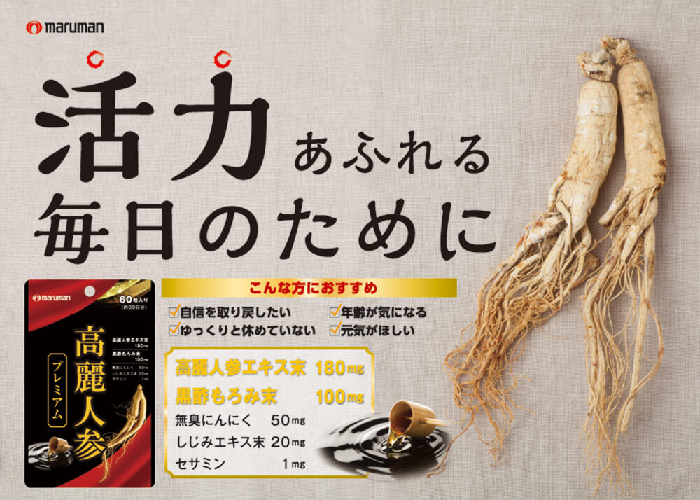 商品説明 広告文責 マルマンH&B株式会社0120-040-562 メーカー名、又は販売業者名 マルマンH&B株式会社 区分 健康食品 製造国 日本 内容量 300mg×60粒(約30日分) 原材料 オタネニンジン抽出物(デキストリン、オタネニンジンエキス)(国内製造)黒酢もろみ乾燥粉末、キノコミックスパウダー(霊芝粉末、エリンギ粉末、アガリクス粉末、鹿角霊芝粉末、冬虫夏草粉末、チャーガ粉末、マイタケ粉末、シイタケ粉末、シロキクラゲ粉末、ヒハツ粉末、還元麦芽糖水飴、無臭にんにく粉末、シジミエキス末(シジミ抽出エキス、デキストリン、コーンスターチ)、黒ごま抽出物/結晶セルロース、ステアリン酸カルシウム、微粒二酸化ケイ素、(一部にゴマを含む) 内容成分 高麗人参エキス末:180mg/黒酢もろみ末:100mg(2粒中) 保存方法 直射日光、高温多湿を避け、冷暗所に保存してください。 賞味期限 パッケージ裏面に記載 お召し上がり方 1日2粒を目安にそのまま水またはぬるま湯と一緒にお召し上がりください。 男性にも、女性にもおすすめ。はつらつとした楽しい毎日に。 高麗人参プレミアム 高麗人参の他、霊芝や冬虫夏草など13種類のキノコを配合。 気になることがありませんか? 年齢が気になる…ゆっくりと休めていない…元気がほしい… 高麗人参プレミアムで活力あふれる毎日に!